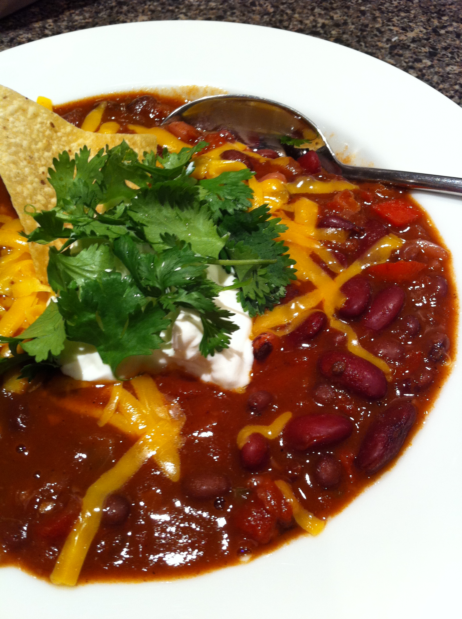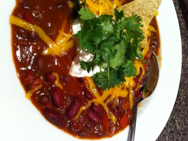 Finally, the husband came home and the chili finished cooking and all was right with the world. I served it up with some grated cheddar, some sour cream and cilantro if you’re part of the cilantro generation (I’m convinced distaste for this herb is directly correlated to your graduation year). Also serve with Beano.