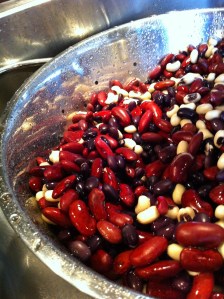 I had dried red kidney beans, black beans and black-eyed peas that I soaked overnight and rinsed. I’m not sure how much I had of each, but it was a lot. Probably 2 cups of kidney, and a cup each of the others. I couldn’t fit them all into my dutch oven when cooking time came, so I probably ended up using about 7 cups of reconstituted beans when the whole thing was done. Canned beans are fine too. Use those if you want – just drain them before you put them in the pot.