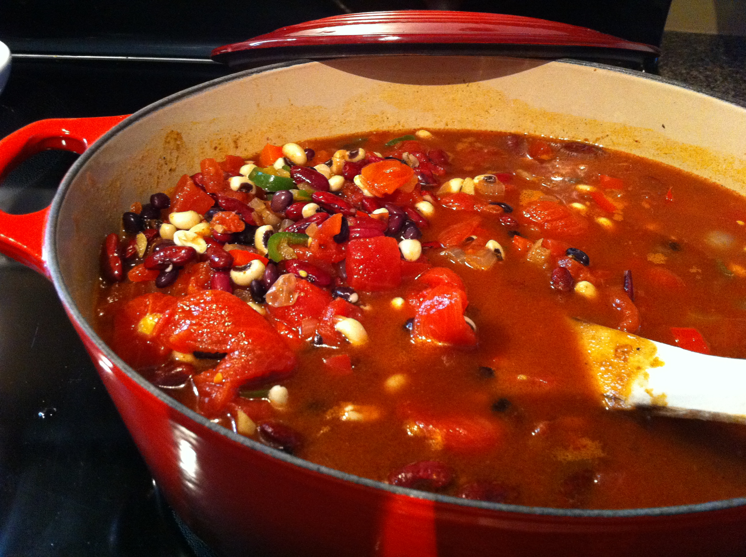 I heated a tablespoon or so of olive oil in our large dutch oven (thanks Aunt Perky and Uncle Russell!) and sautéed the peppers and onion for about 5 minutes over medium heat. Then I added the garlic and the contents of the spice packet and a bit of extra cumin and coriander (say, a teaspoon of each?) and cooked that with the veg for a minute or two to get things going. Then I poured 1/2 a can of beer into the pot to deglaze it a bit and brought it to a boil and let it cook down for about 2-3 minutes until it had thickened up. Add the beans, add the tomatoes and bring to a boil, stirring to make sure things don’t stick. Once it’s there, turn down the heat to low to simmer covered for 2 hours or so.