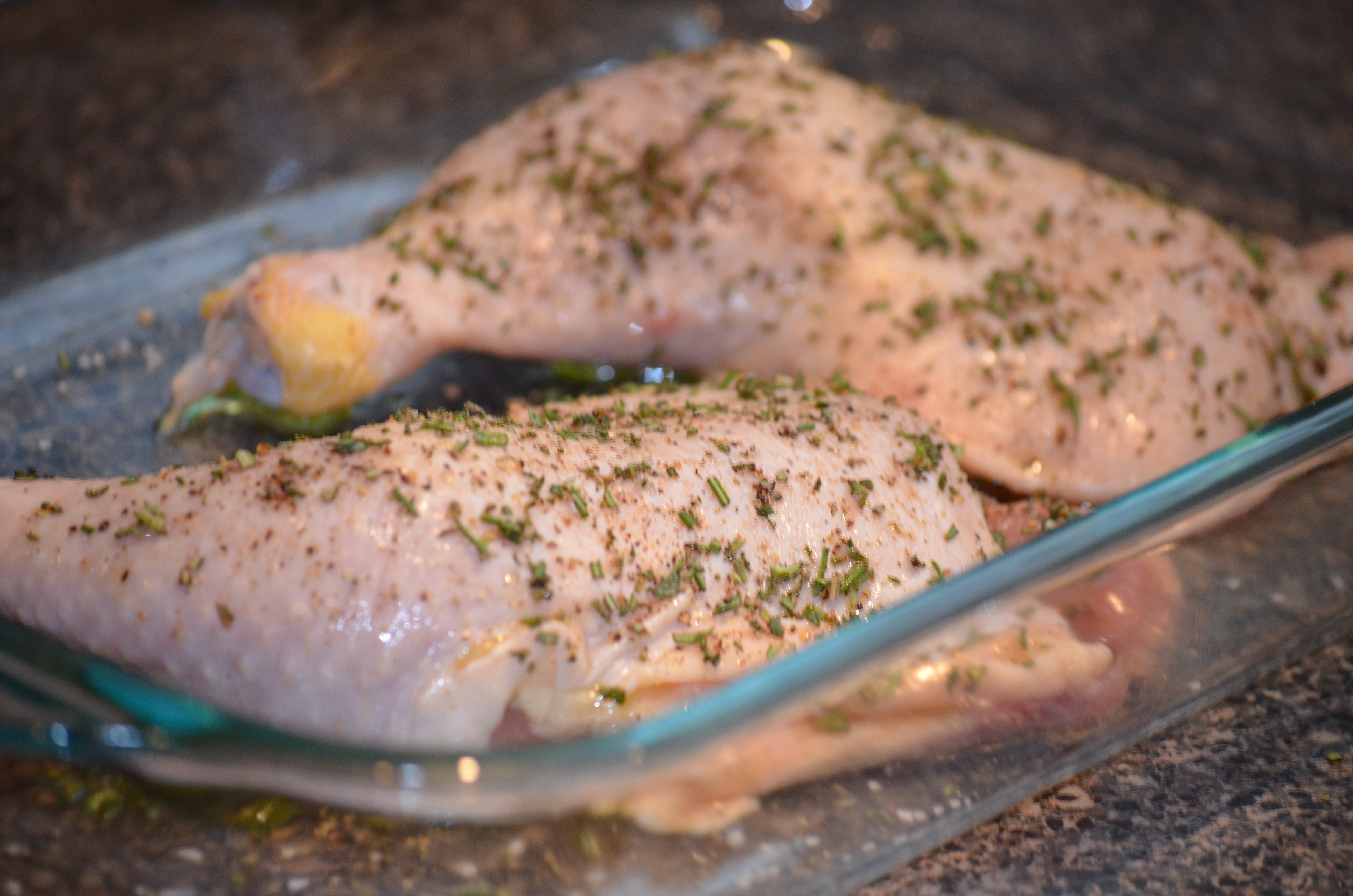 To make the chicken, I preheated my oven to 425° which, because of our cheap-ass appliances, takes approximately 3.5 hours and warms the house to a nice Bikram-yoga-esque feel. During that time, I try to stay hydrated and head outside to gather some sage and rosemary from the garden. Give the herbs a chop, or not if you’re using dried, and rub those sexy little thighs down with some olive oil, salt, pepper and the herbs. Toss them in a Pyrex and cook at 425° for about 45 minutes or until a thermometer reads 165°.