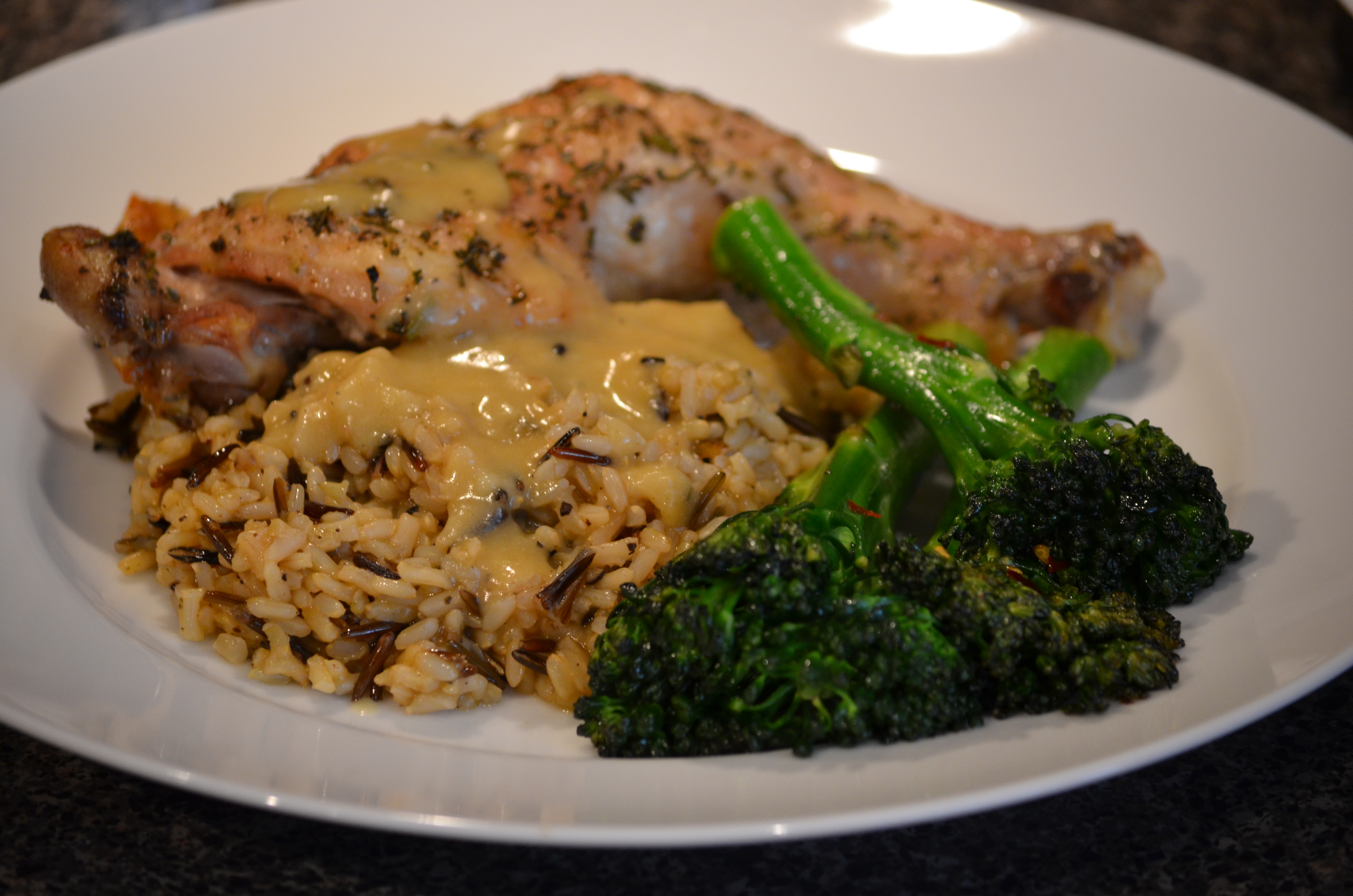 Everything came together in under an hour, including a really weird gravy. We were out of chicken stock at home, so I thought I’d try to make a pan gravy using veggie stock. Don’t do this. Please. I thought it tasted terrible, but my sauceketeer actually made it edible by adding about a tablespoon of Dijon mustard at the end (good idea). Honestly, though, if you don’t have chicken stock (or a cunning saucesketeer), just forego the gravy.