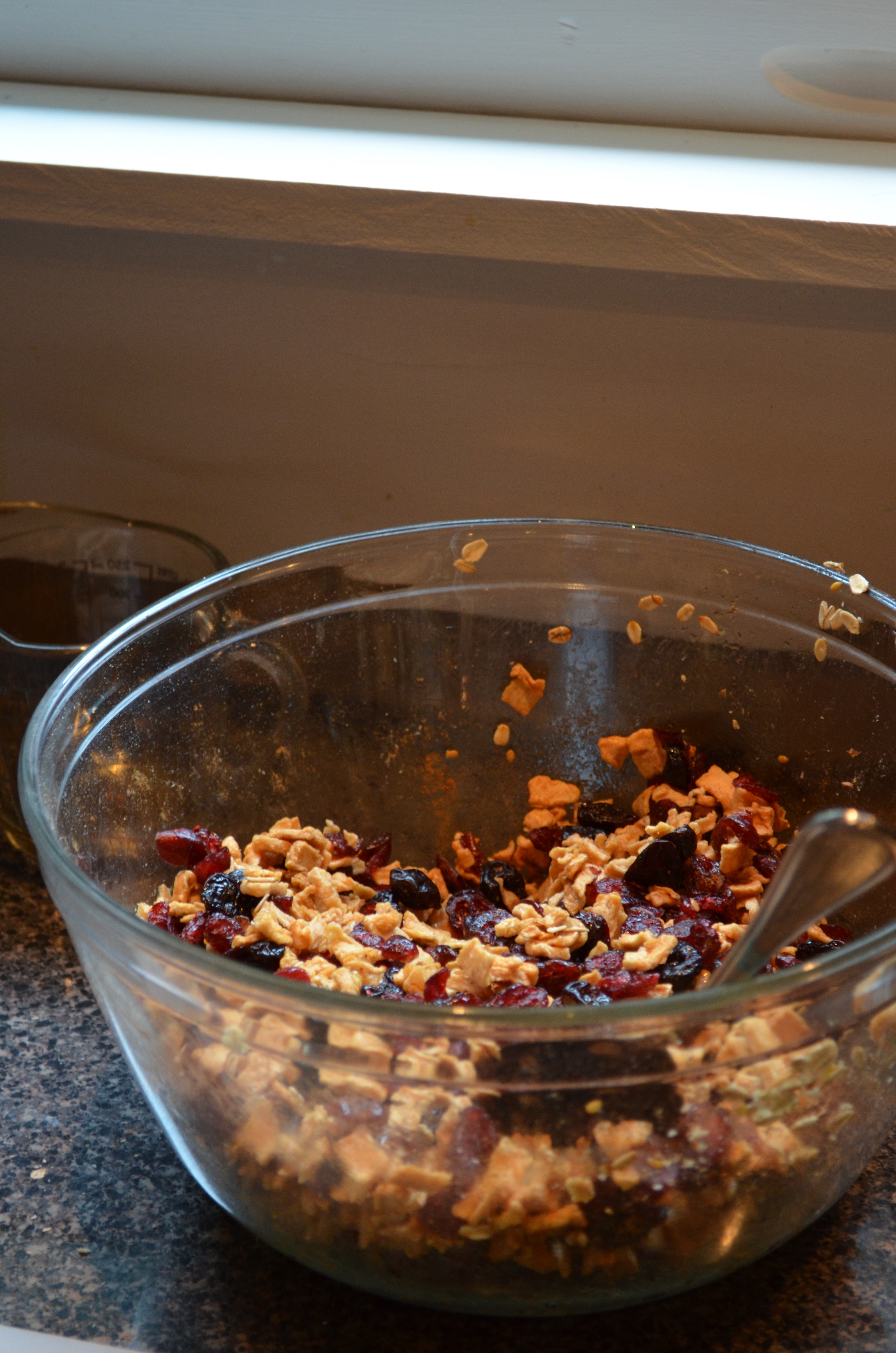 HALT! Before you go dumping all of this into a big bowl and cramming it in your (preheated to 375°F – whoops, should have said that 3 paragraphs ago) oven, I have perfected the granola so that your nuts and oats get crunchy and your fruit stays soft and chewy. You’re going to do this in two batches – the first oats and co., the second fruits-r-us.