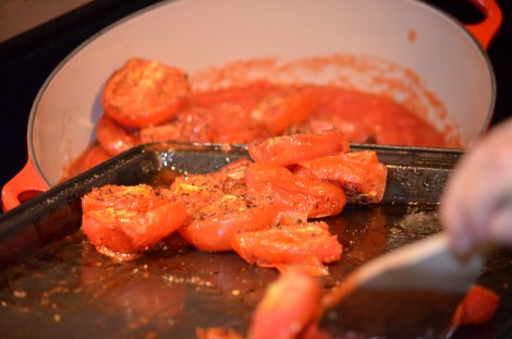 While those are roasting, you can start on the soup on the stove. Heat a tablespoon or so of olive oil in a large dutch oven over just north of medium heat and sauté the onions until they begin to get a bit of color on them – about 8 minutes. Add the garlic and cook that for only about a minute. Add the two large cans of tomatoes, the basil, the thyme sprigs if you’re using them and the chicken stock and let simmer while the roasted tomatoes finish. Once they’re done, add the roasted tomatoes to the soup base and cook for another 20 minutes or so.