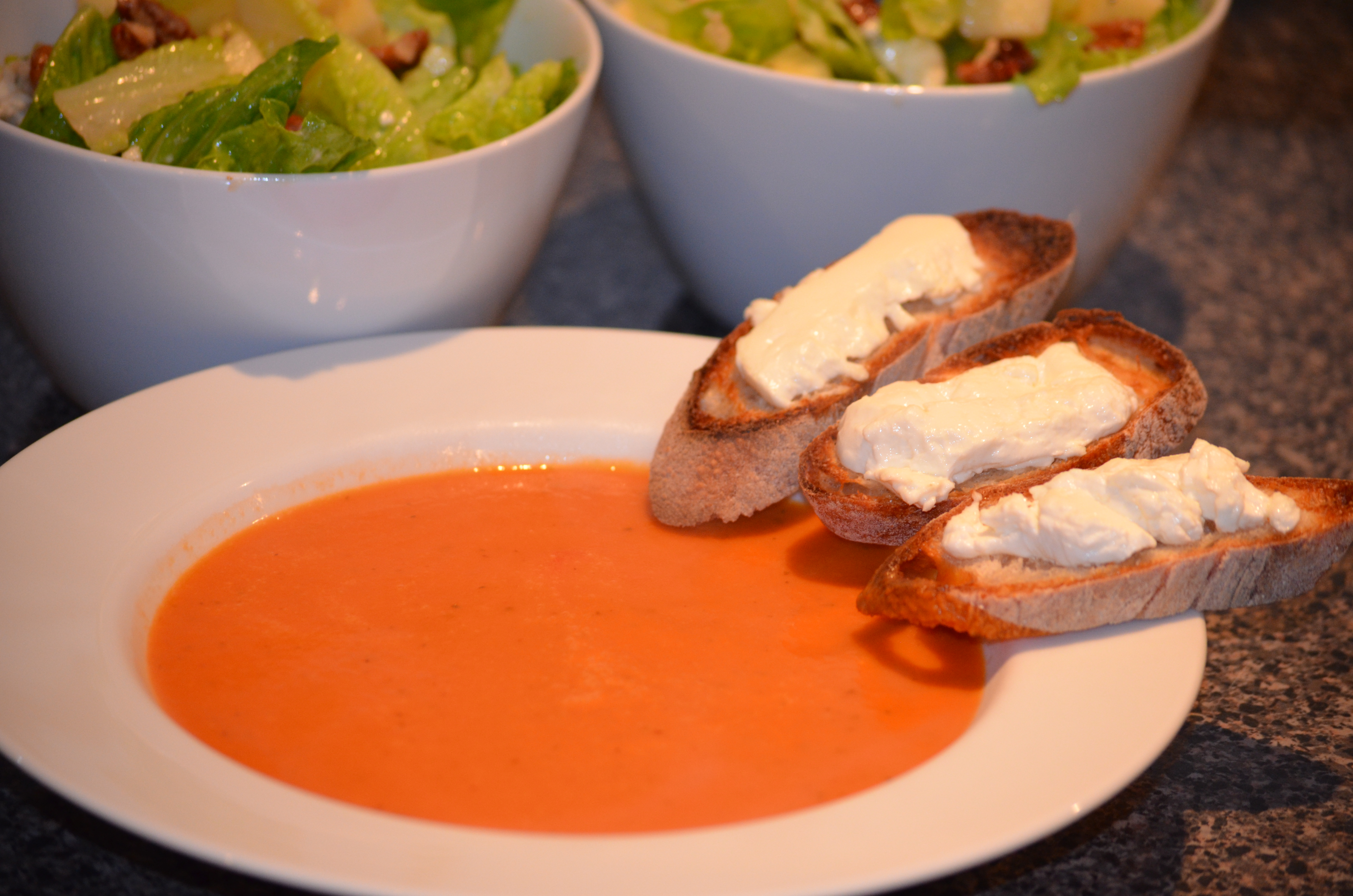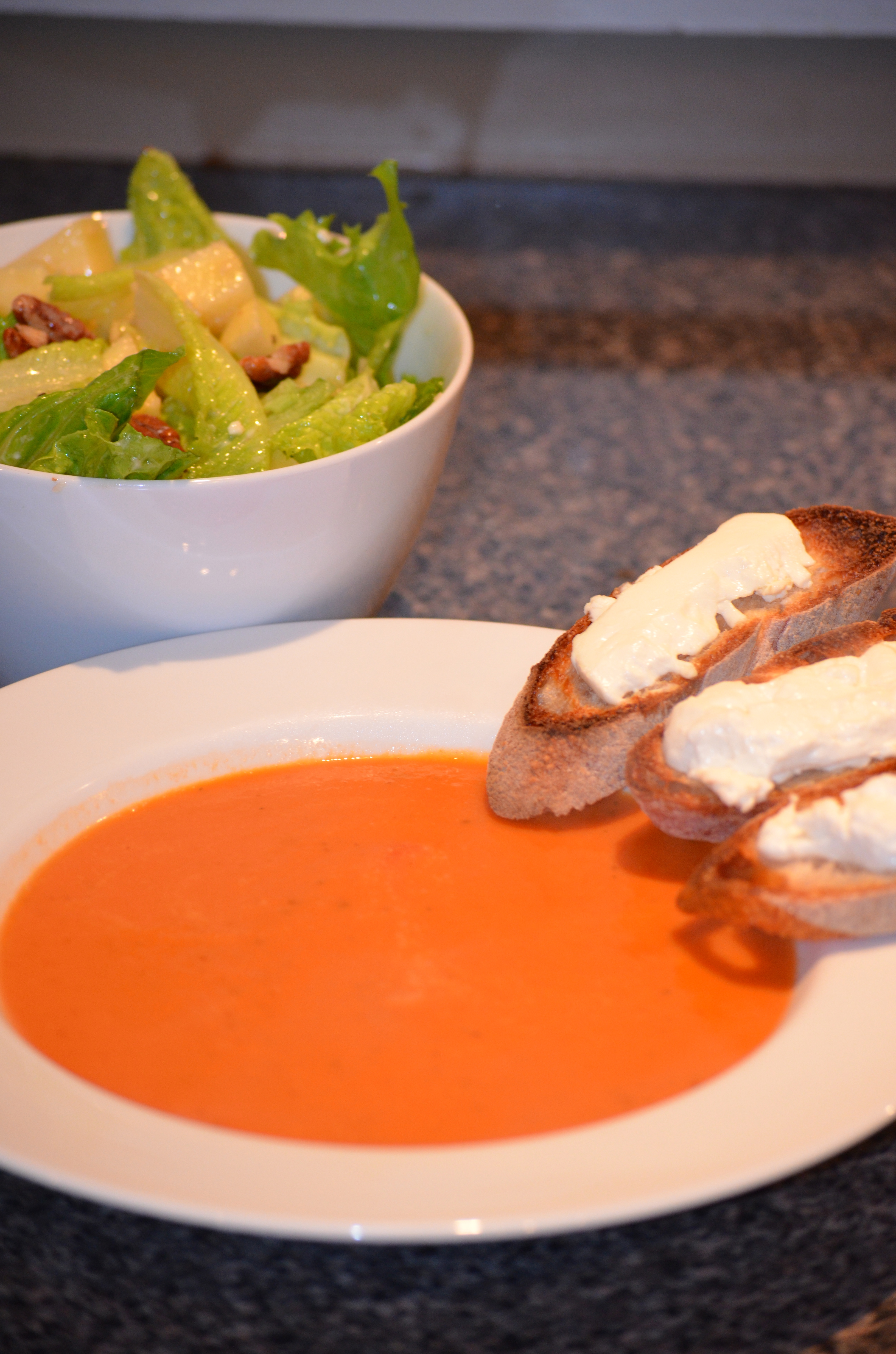 Once you’ve pureed everything and it’s back on the stove, fix up whatever you want to serve with it. Grilled cheese goes well, a salad too, tartines (shown above – little toasts with goat cheese on them) and some would even say you could serve this with A FRICKING HOT DOG. It’s up to you.