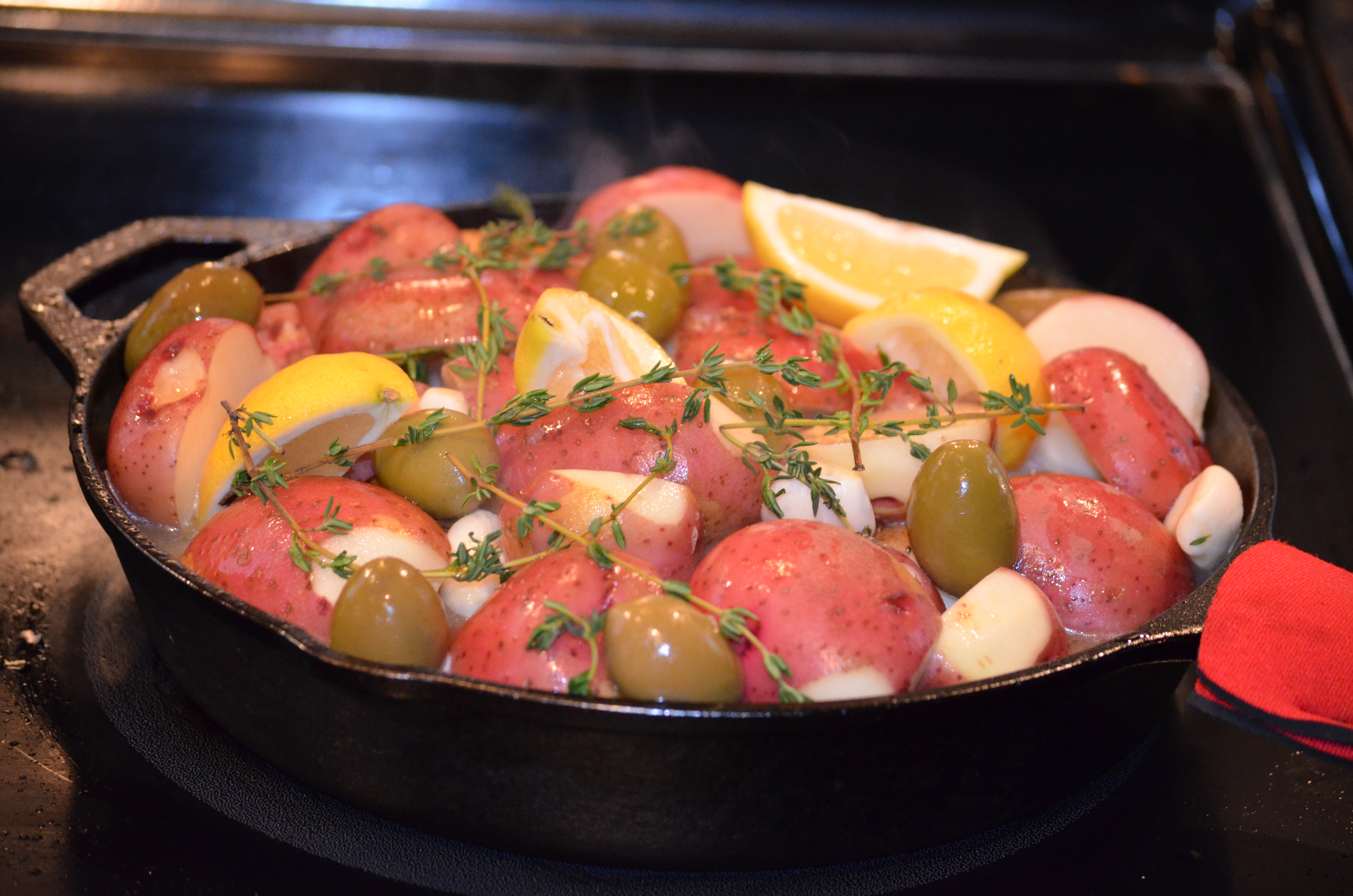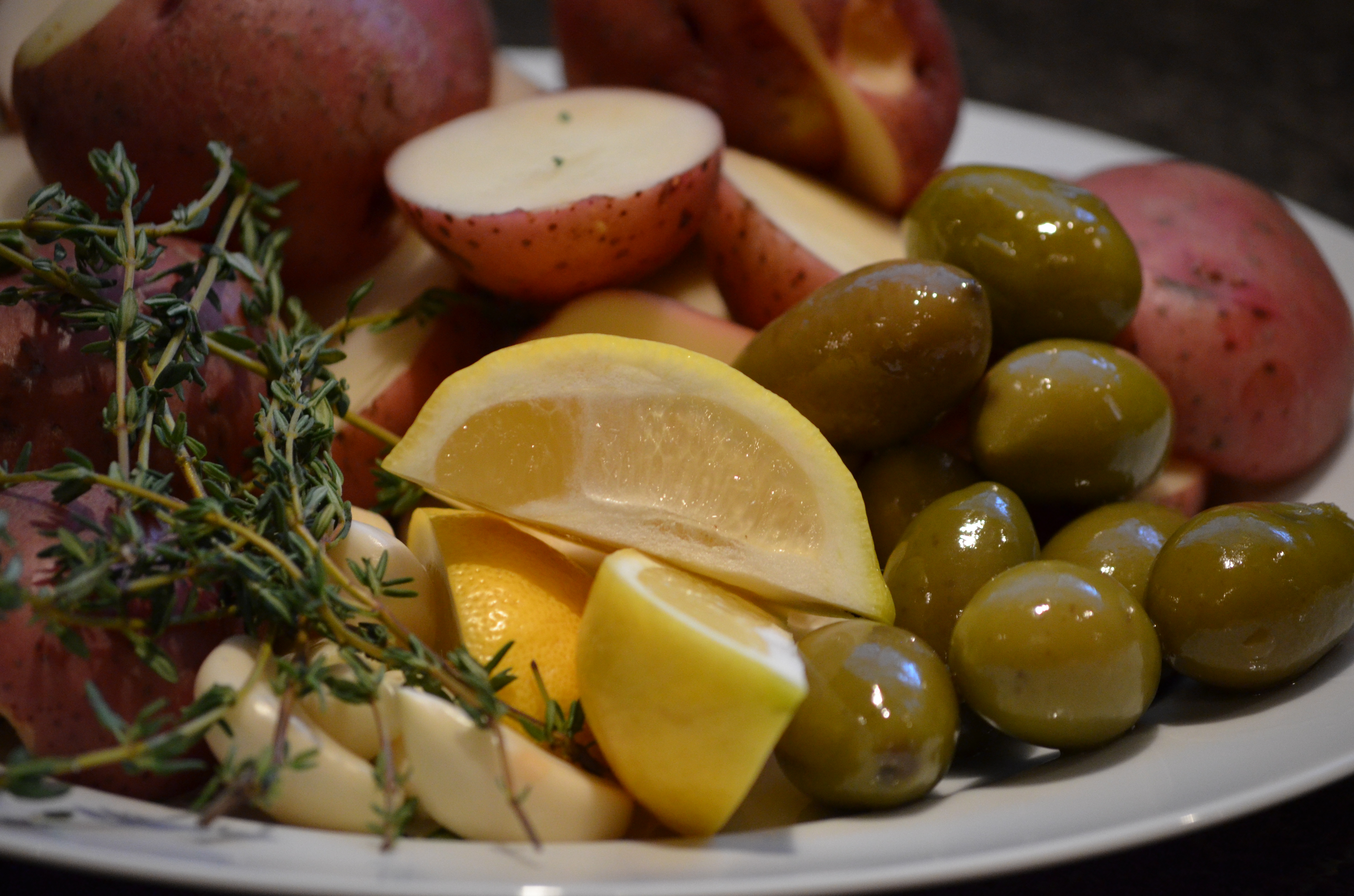 Before you get cooking, go ahead and wash and cut your potatoes into reasonable-sized pieces if they’re too big. Peel your garlic, cut your lemon, arrange your thyme and salt and pepper your chicken. Or as Homer would say to Bart, “butter your bacon… now bacon your sausage!”