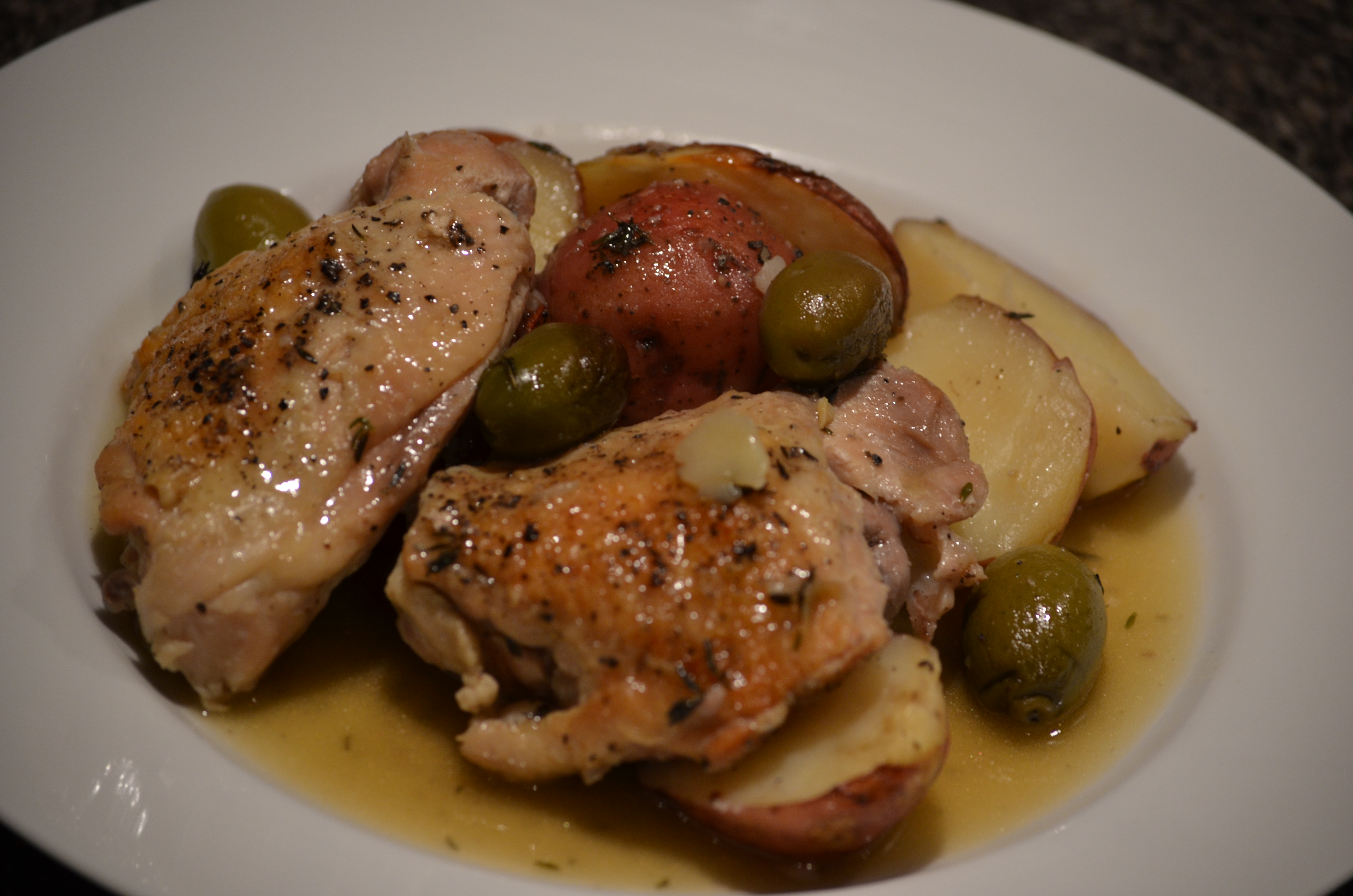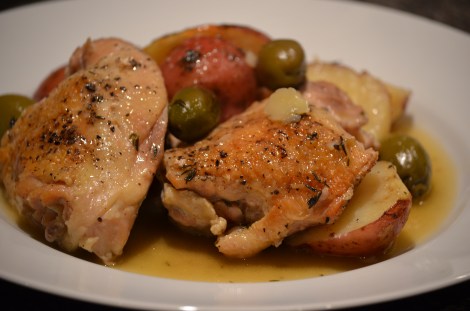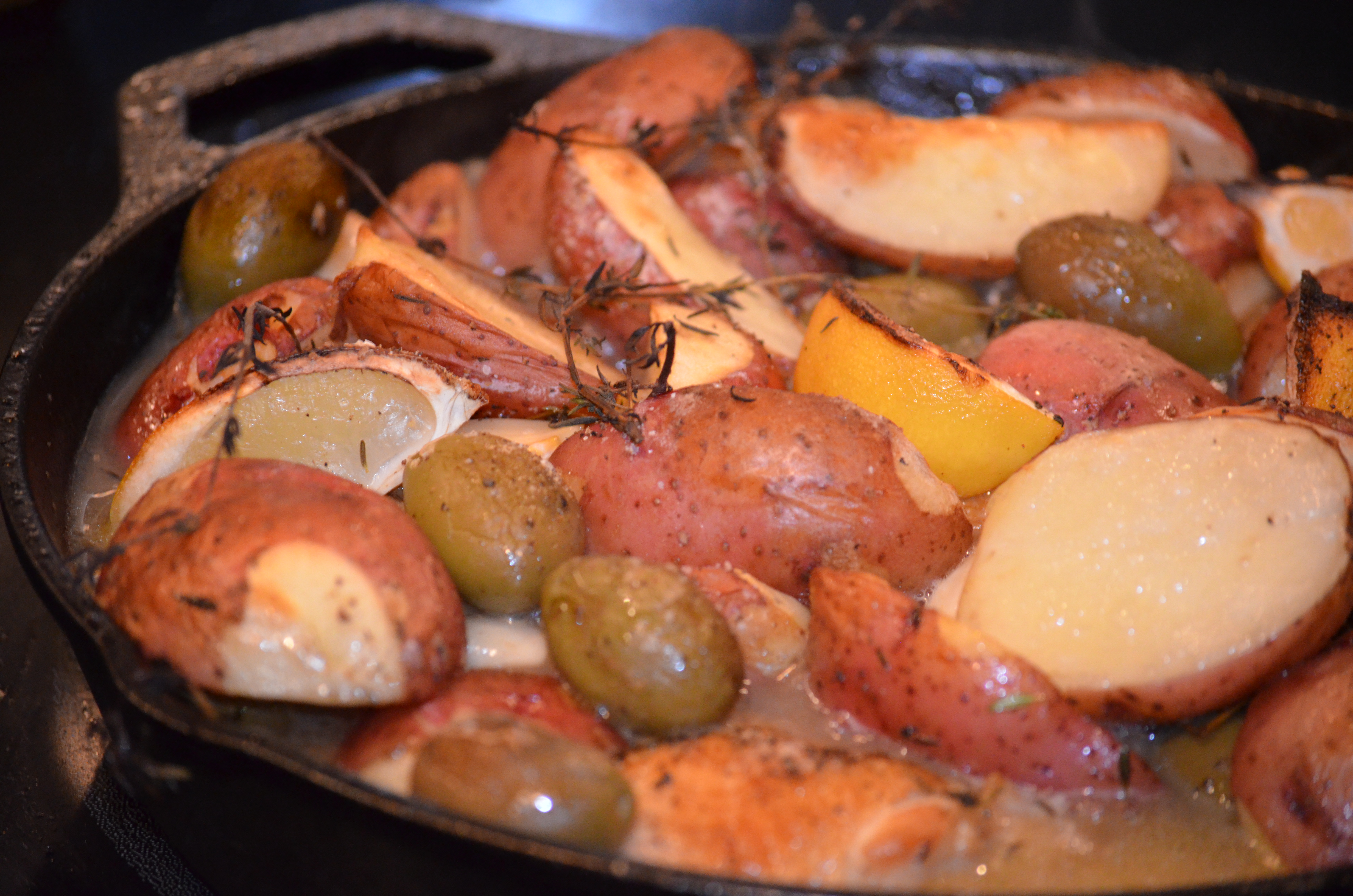 Flip your chicken over and add one cup of the chicken stock and all of the potatoes, olives, garlic, thyme and lemon. Just snuggle them all in. Bring the stock to a boil.