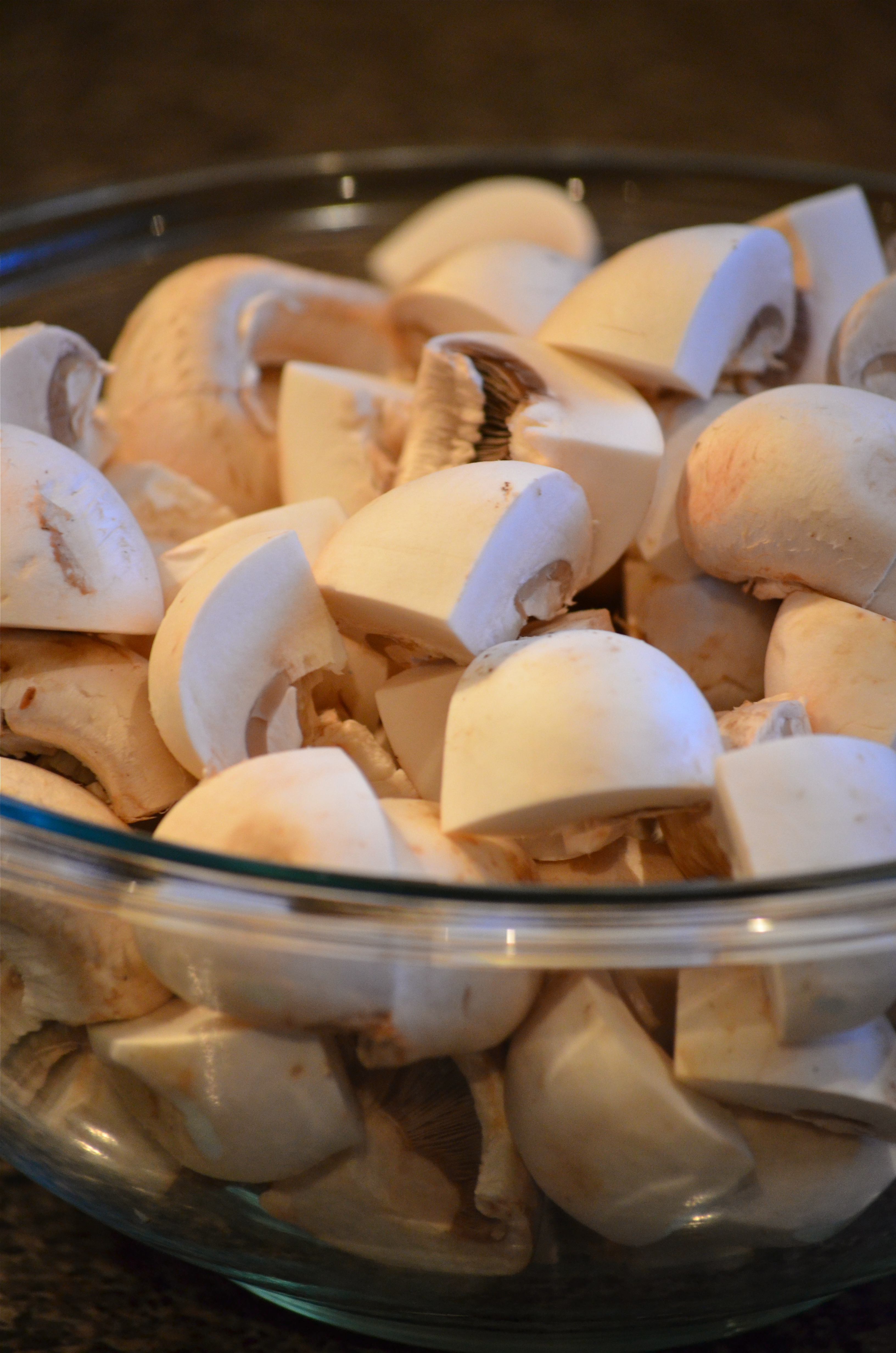 I presume you’ve sliced your meat, so go ahead and prep your mushrooms and shallots. I like my mushrooms quartered if they’re big because I like big bites of them. You can slice them to your liking. While you’re slicing and dicing, heat a large skillet over medium high heat.