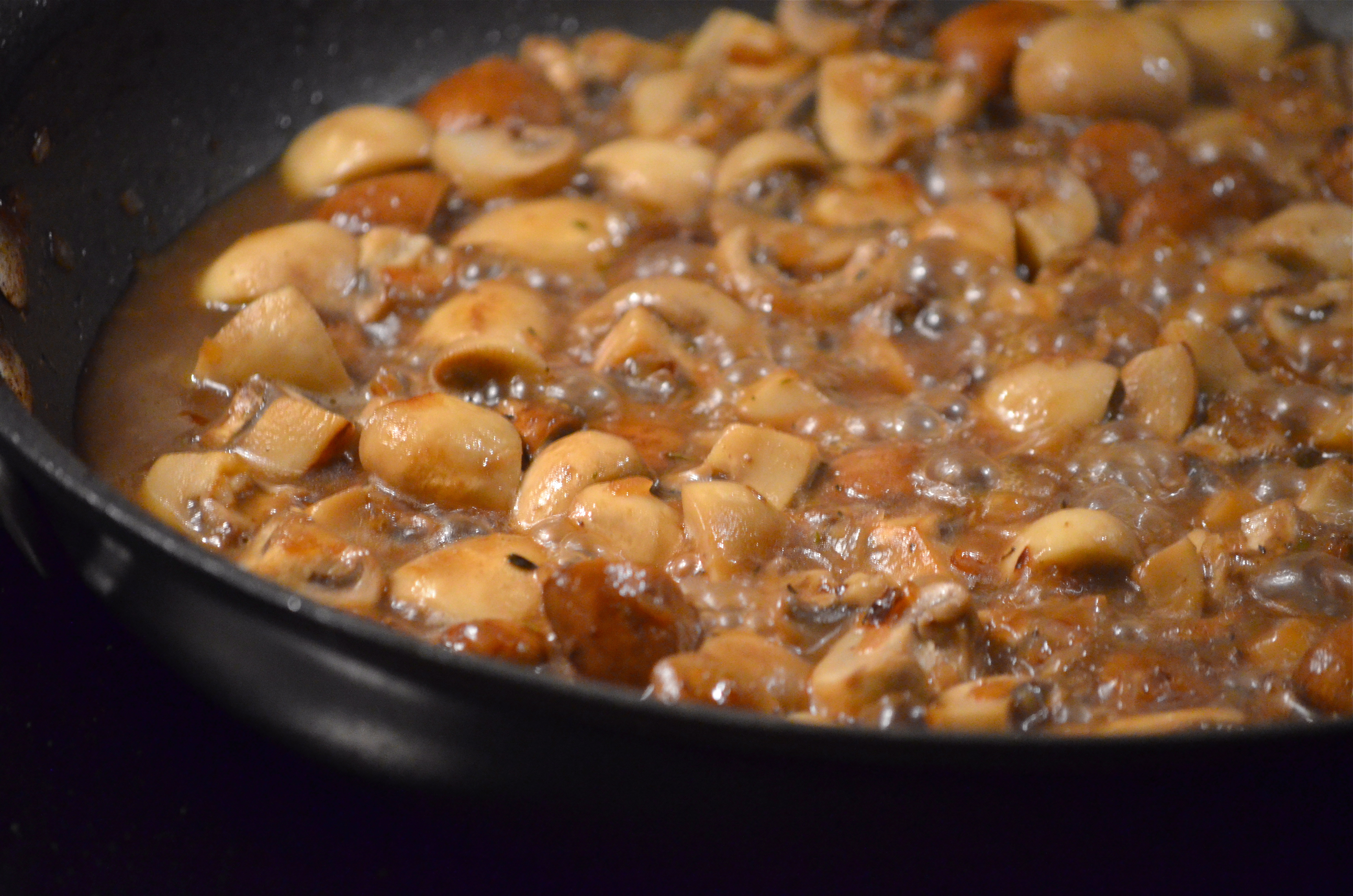 Go ahead and throw the beef into the skillet to brown for about 2-3 minutes (season with salt and pepper while you’re at it). You don’t want to over-cook the beef so you’ll really just be throwing it in to give it some color and pull out some of that fatty goodness for your mushrooms.