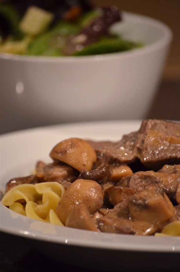 The sauce and meat can hold momentarily while you drain the noodles and get everything ready to go. I serve this with a salad and bread. I serve everything with a salad and bread (including salad and bread). I’m sure the steak would have been outstanding grilled with a baked potato but this was pretty damn tasty and I’m sure I’ll be heading down south again soon and can grab another one. And let’s just say you’re not one of those people who keeps a cooler in their car to stock up on beef and pork and shies away from the whole “eating animals” thing – I think this recipe would still be good if you left out the beef part of the stroganoff all together and made mushroom strogi instead. Not AS good… but still good.