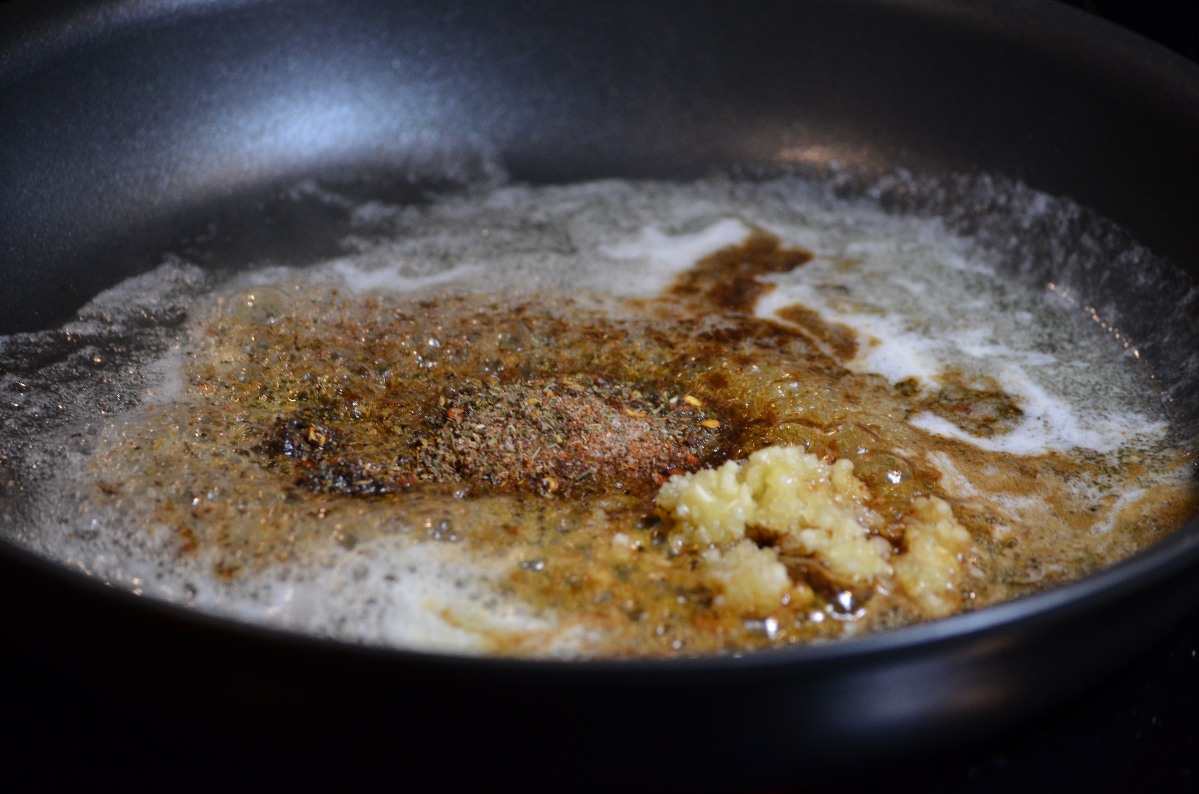 Heat a large skillet over high heat. Add the butter, herb mixture, garlic and Worcestershire sauce.
