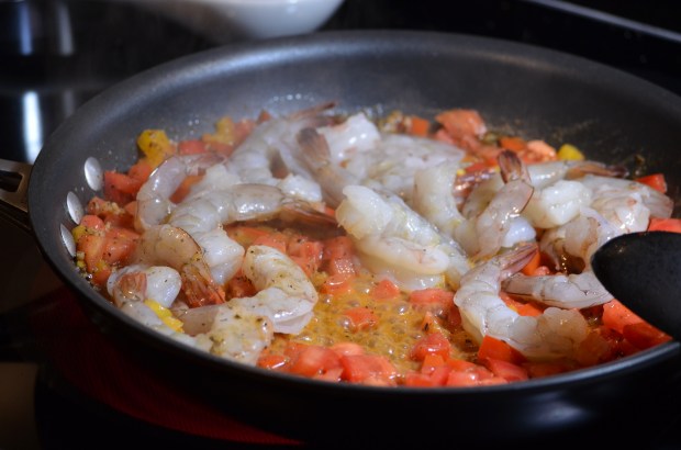 Once the butter melts and things start getting aromatherapeutic, add the tomatoes and then the shrimp and cook for two minutes, stirring well.