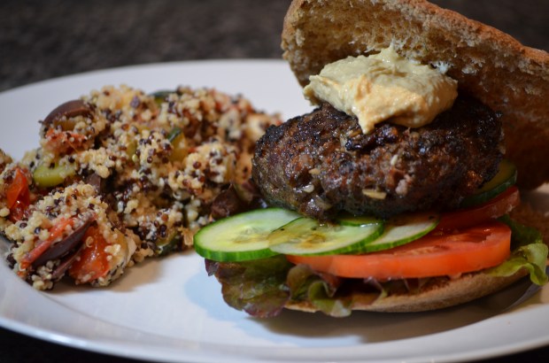 Back to the burgers – the recipe is simple but if you start making sauces and the like it can get time consuming. My advice is to make hummus and tzatziki sauce the day before so it can “mature” for you and make an easy side like oven-roasted potatoes that you can dip in the aforementioned sauces. I made quinoa and couscous with sautéed zucchini, red peppers, onions and tomatoes this time. If you want that recipe, tell me. I’m not very good about focusing on the sides.
