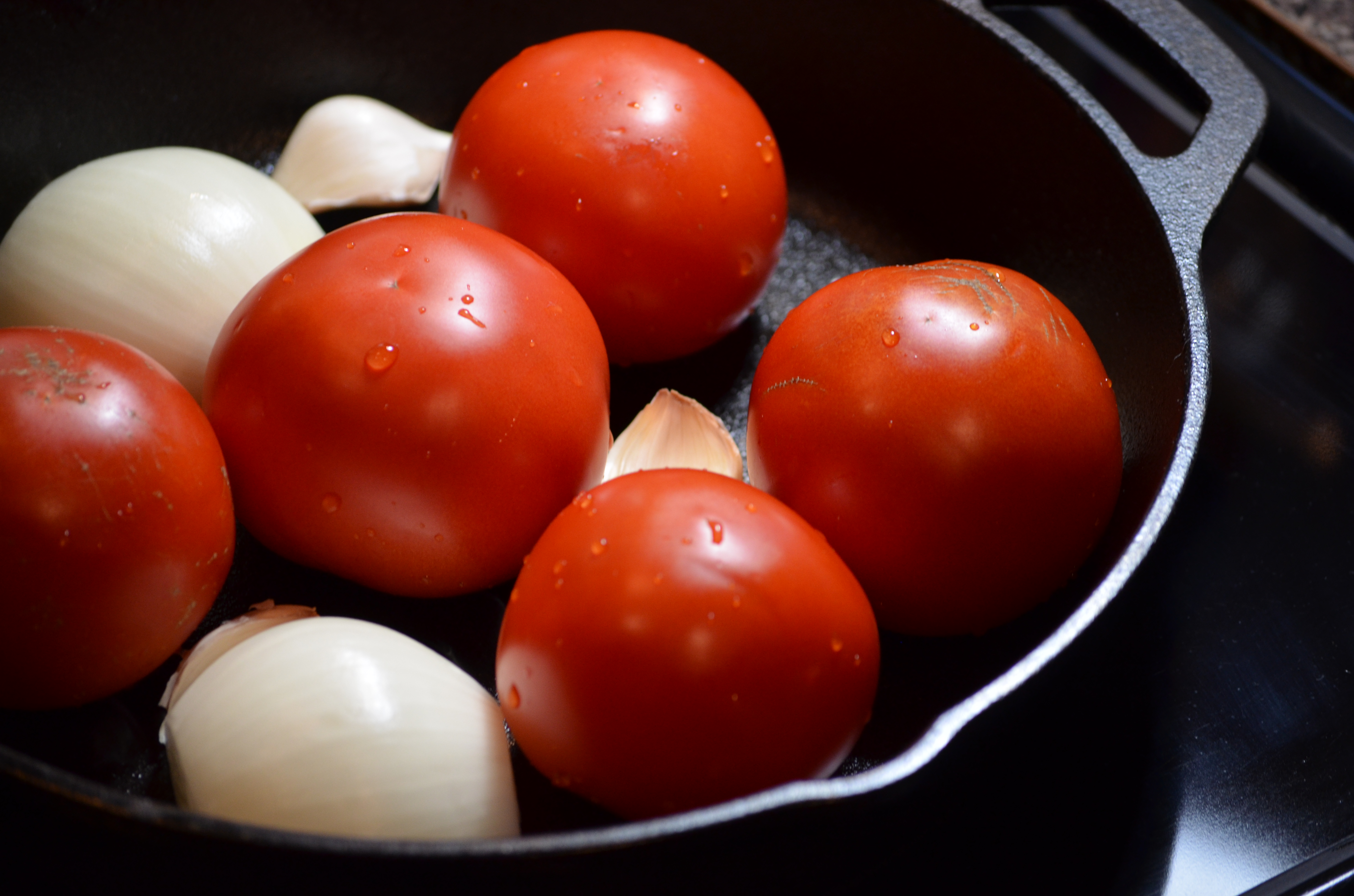 Heat a heavy skillet over medium to medium-high heat. Put the tomatoes, onion and garlic in the skillet and start to char it. You can use a dry skillet or add a bit of olive oil if that makes you nervous. The oil will smoke though, so fair warning that you should crack a door and turn on the fan.