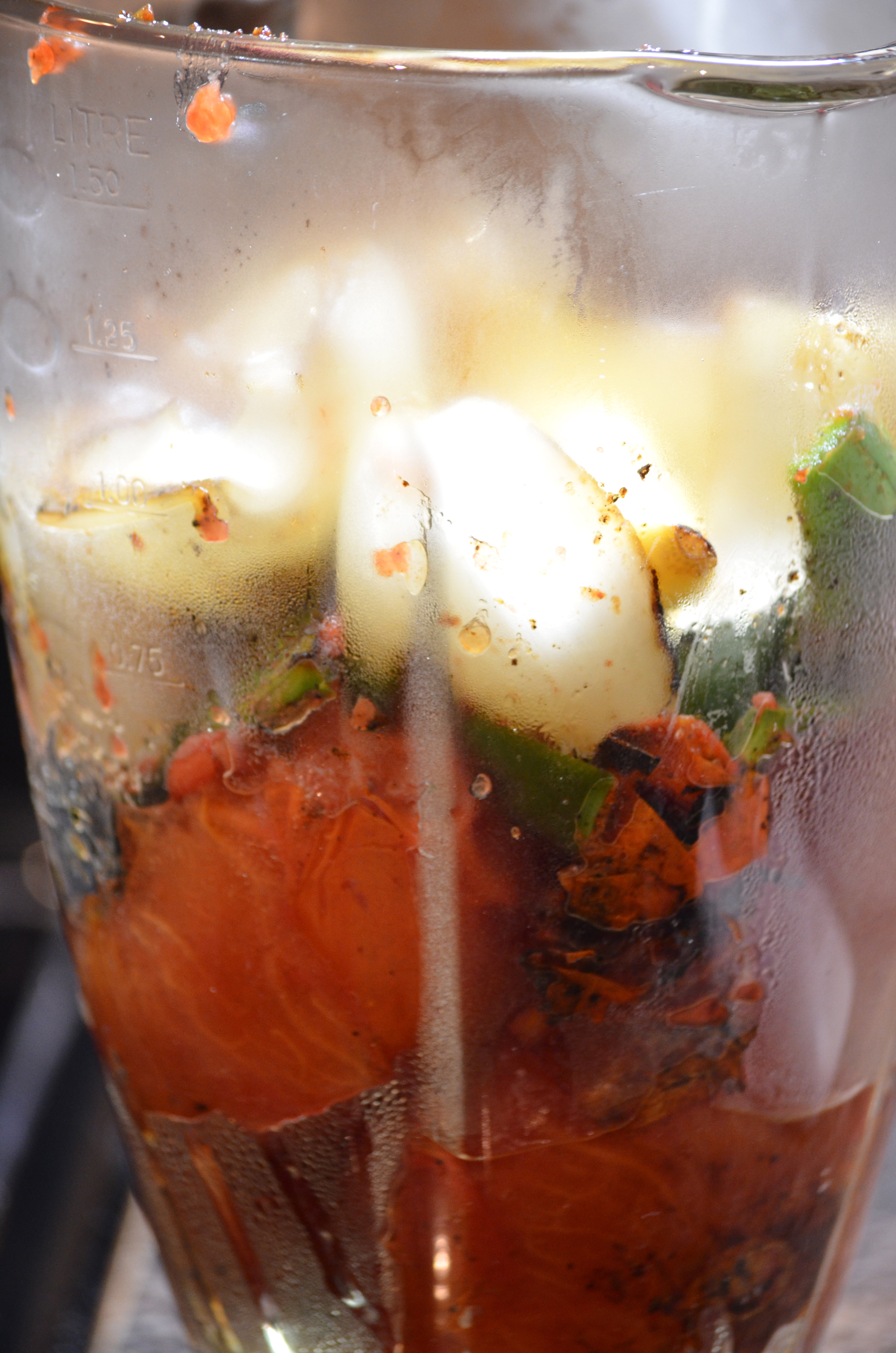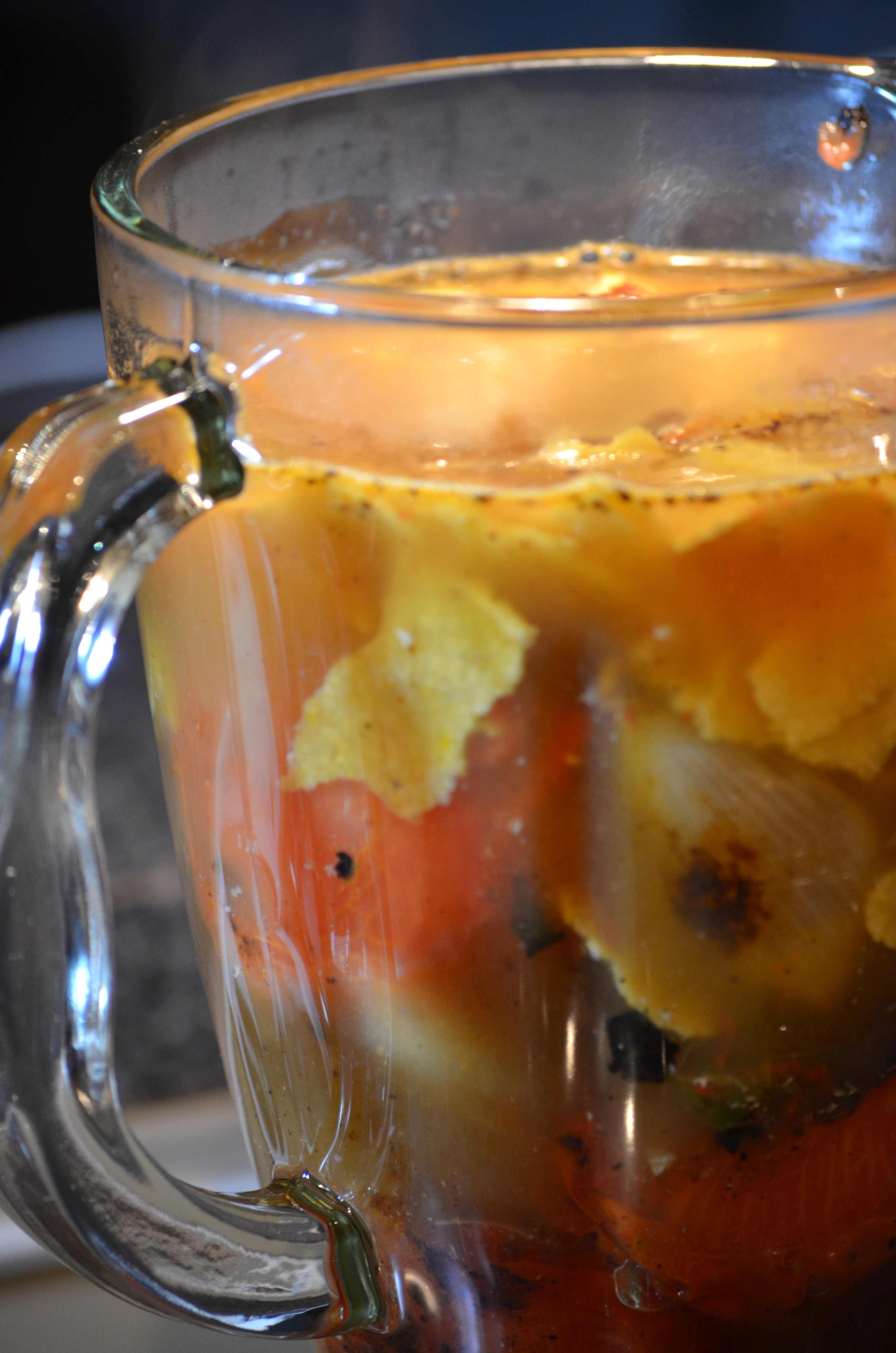 Grab your blender and dump in the tomatoes, jalapeno, eventually-peeled garlic, onions, and the torn up tortillas.