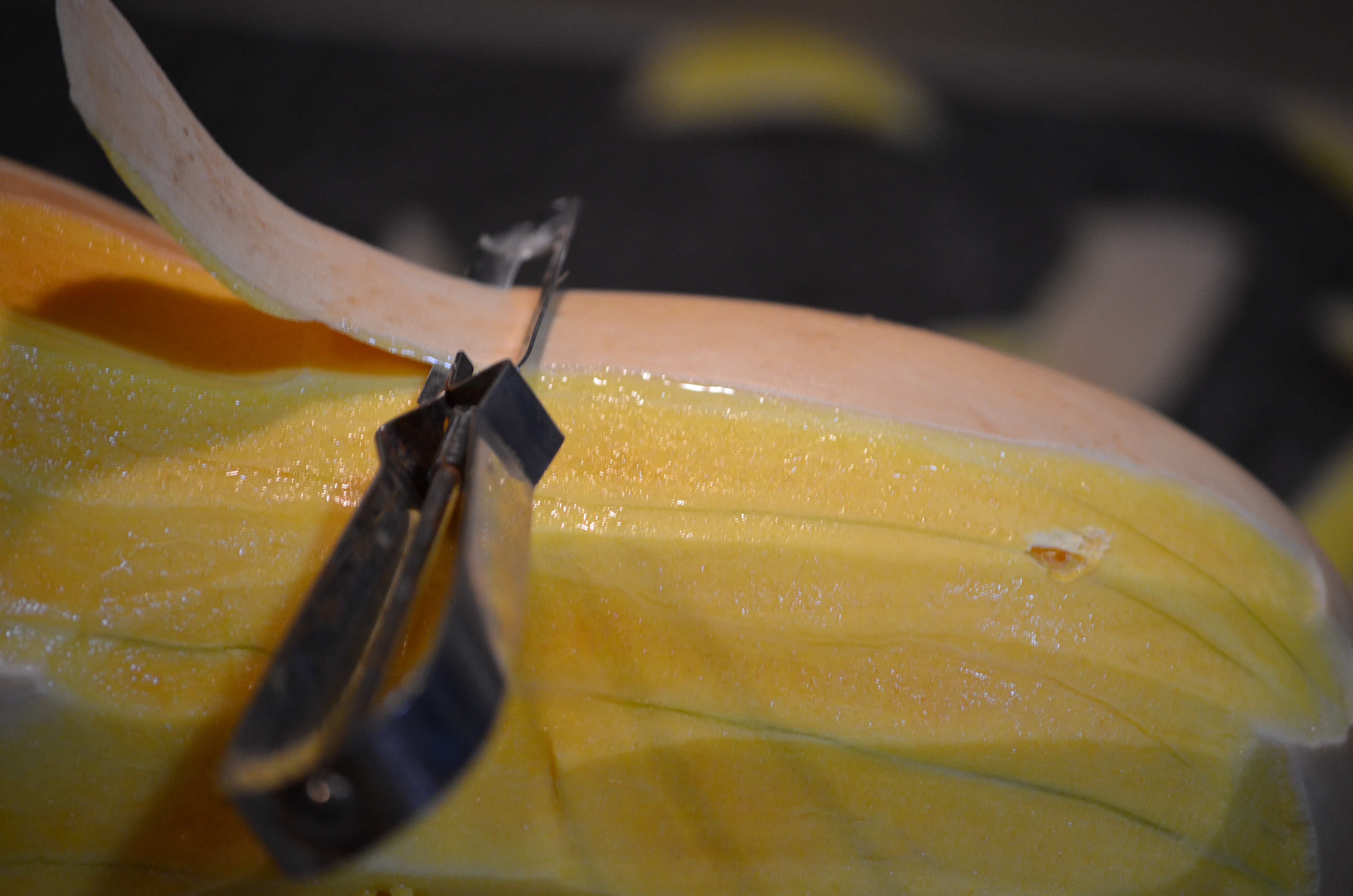 There’s a lot more of him than this but I liked his outie and wanted to share. This guy weighed in at almost 5 lbs. at the market and broke the scale when I plopped him in it. You don’t need this much squash for the recipe but if you have it, go for it. First you need to peel him – and I suggest using a knife rather than a peeler. This task almost did it in – and this peeler has been around since my birth.
