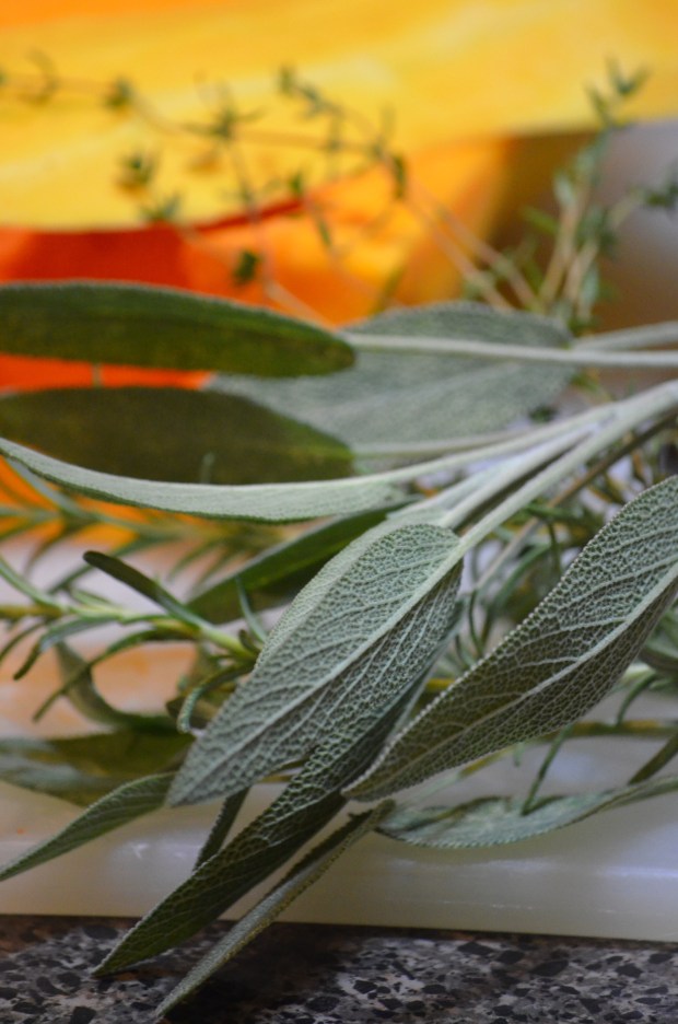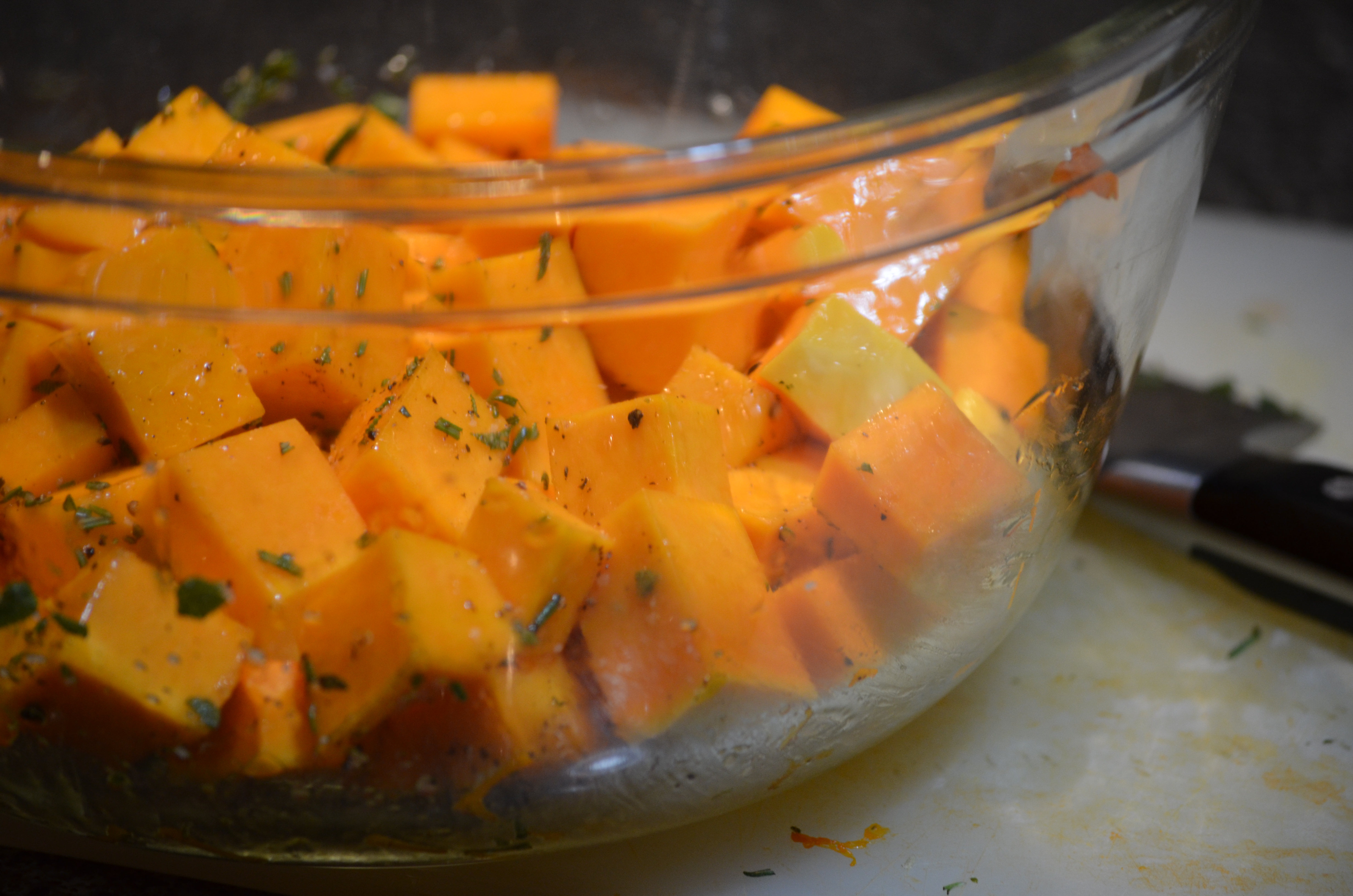 Chop up your fresh herbs and toss the cubed squash, 1/2 teaspoon of the thyme and all of the sage and rosemary into a bowl with the olive oil to coat. If you don’t have fresh herbs, the rule is to use dry but use half of the amount called for.
