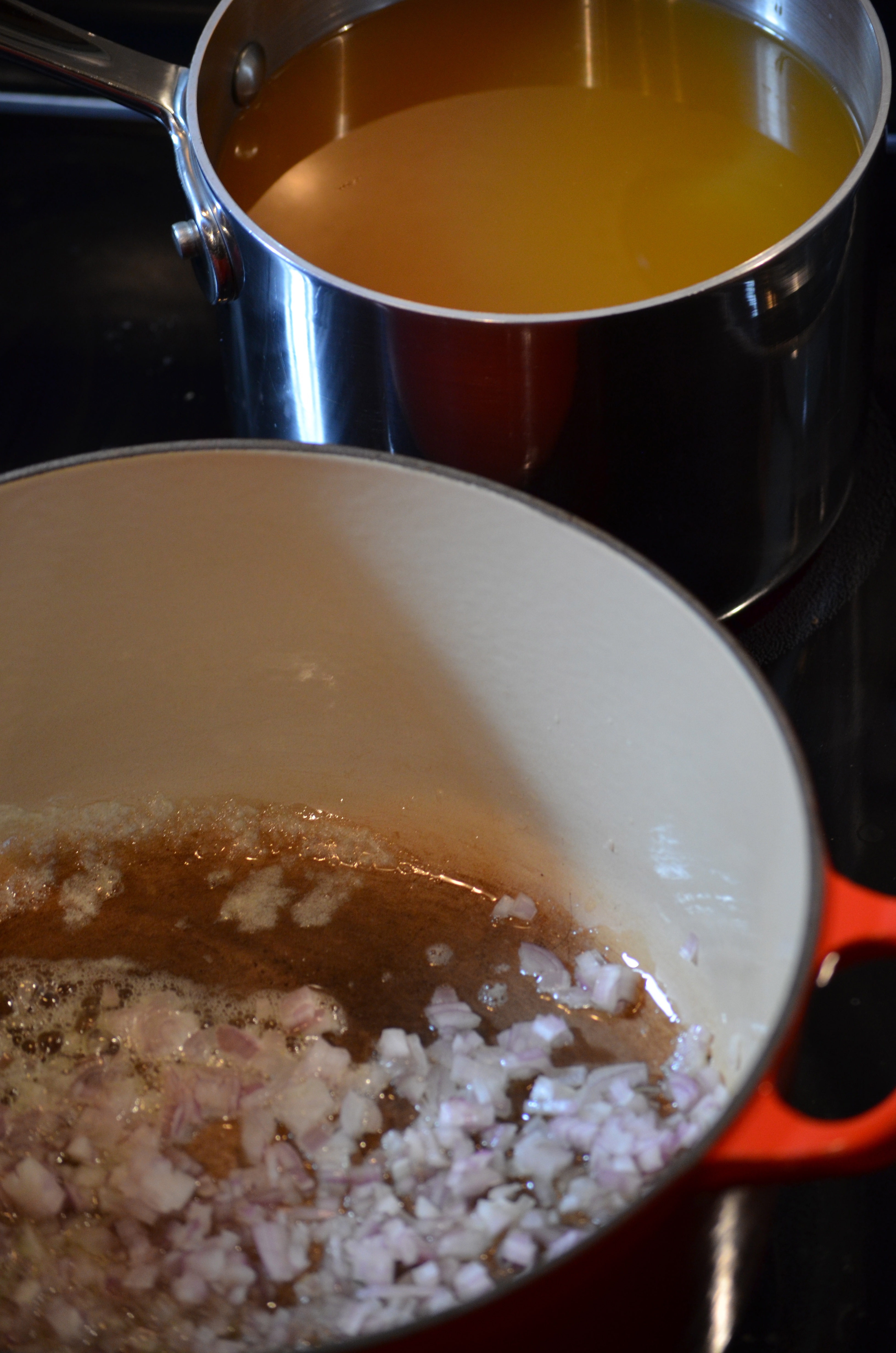 Risotto is made by adding small amounts of warm stock to the rice in the pan until it’s almost absorbed and doing it again until the rice is cooked. This generally takes around 30 minutes from start to finish and is really relaxing, actually. Melt your butter over medium low heat in a large, heavy bottomed pan and add the shallot. Cook until translucent but not brown – about 10 minutes.