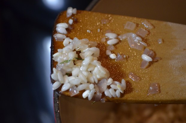 Add your rice to the pan and cook with the shallots for about 3-4 minutes until the edges of the rice begin to turn translucent. You want all the tasty butter and shallots to be absorbed by the grain and get you off on the right foot.