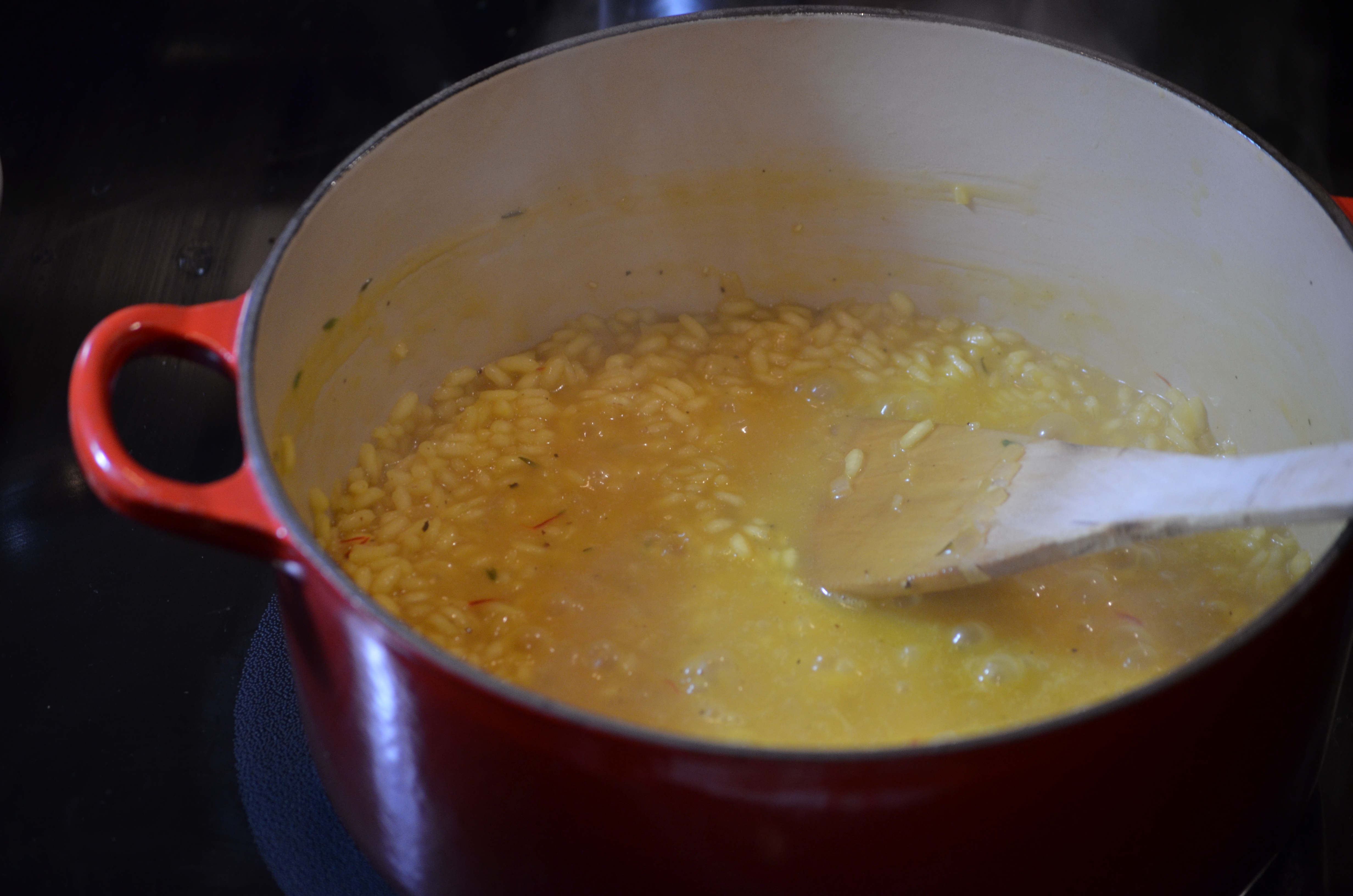 Once your rice looks like this, you can add the wine and stir until it is almost completely absorbed. Once the wine is absorbed, add 2 ladle-fuls of chicken stock, the thyme, saffron and season with salt and pepper. Stir often until the stock is almost completely absorbed and then add some more, 2 ladle-fuls at a time.