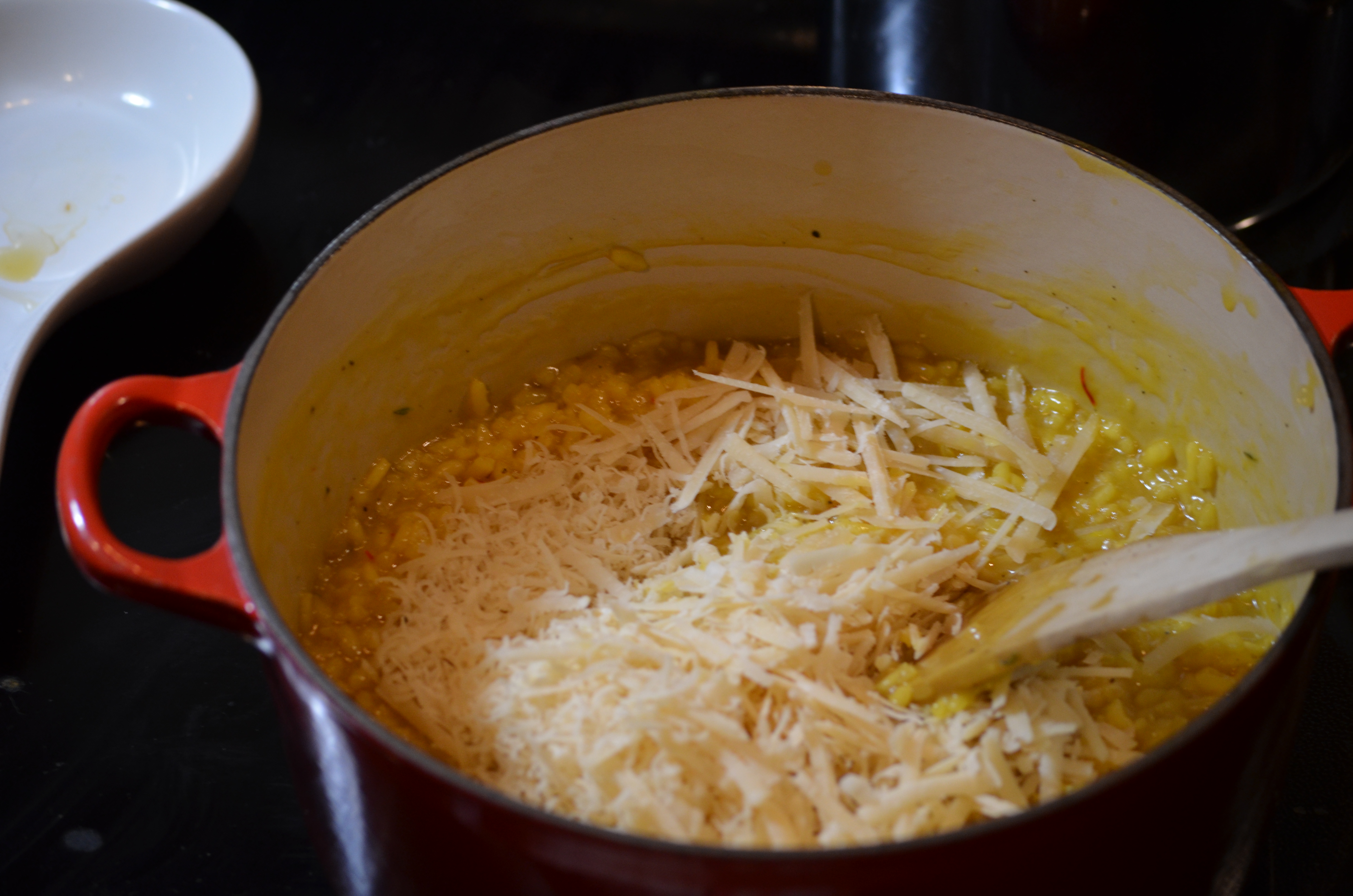 The set-up with risotto isn’t hard at all but you should have everything ready to go before you get started since a lot of your free time is going to be spent stirring. Have your minced shallot ready, your saffron on hand and the parmesan grated and standing by. Make sure the Arborio and wine is measured out and once this is done, you can get to work.