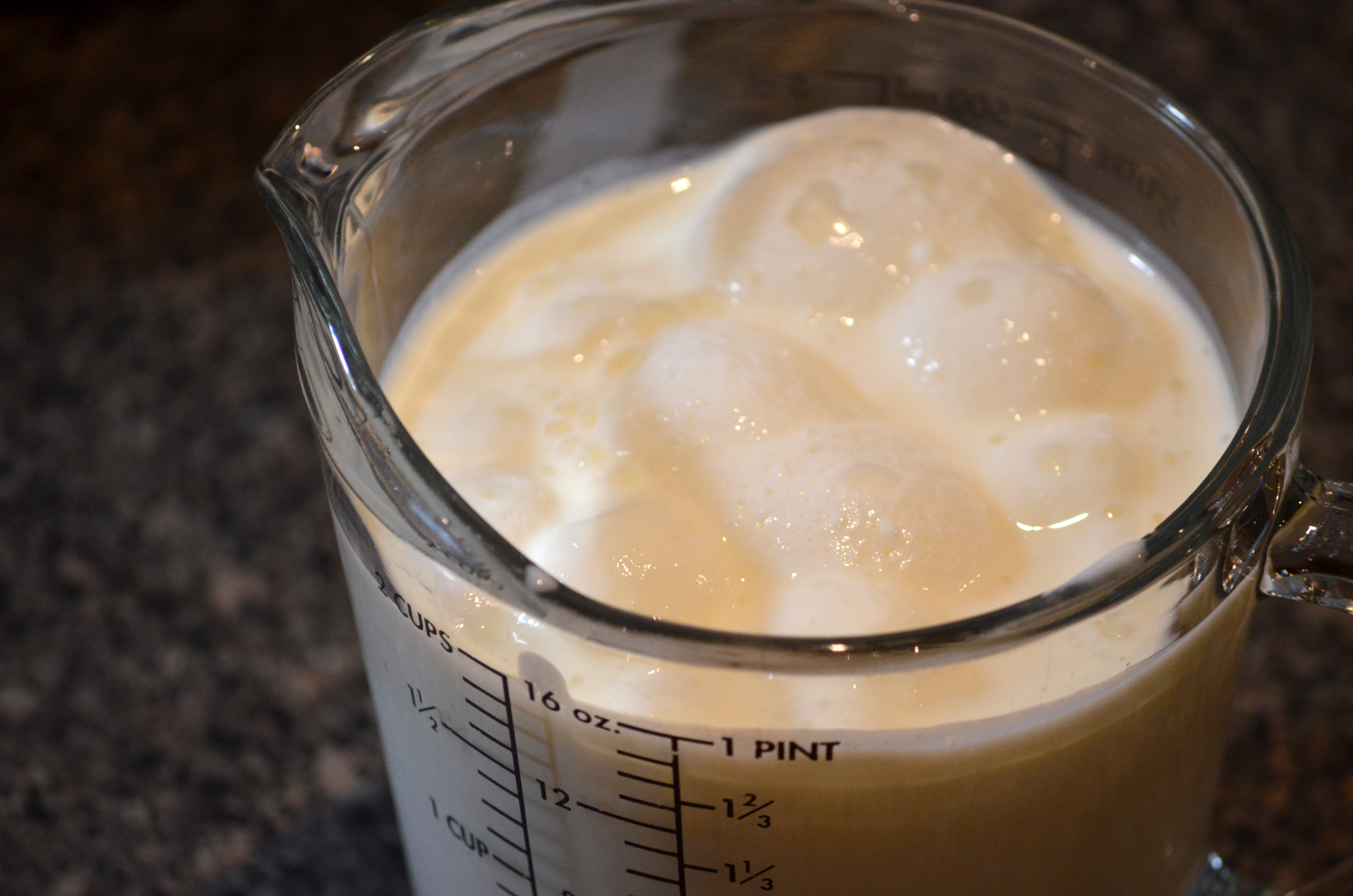 Preheat your oven to 325°. Add the baking soda to your buttermilk to activate it. Now is the time for a Mr. Wizard (if you’re a child of the 80’s) or an Alton Brown (if you’re a child of the 00’s) moment. I love this part. Science!
