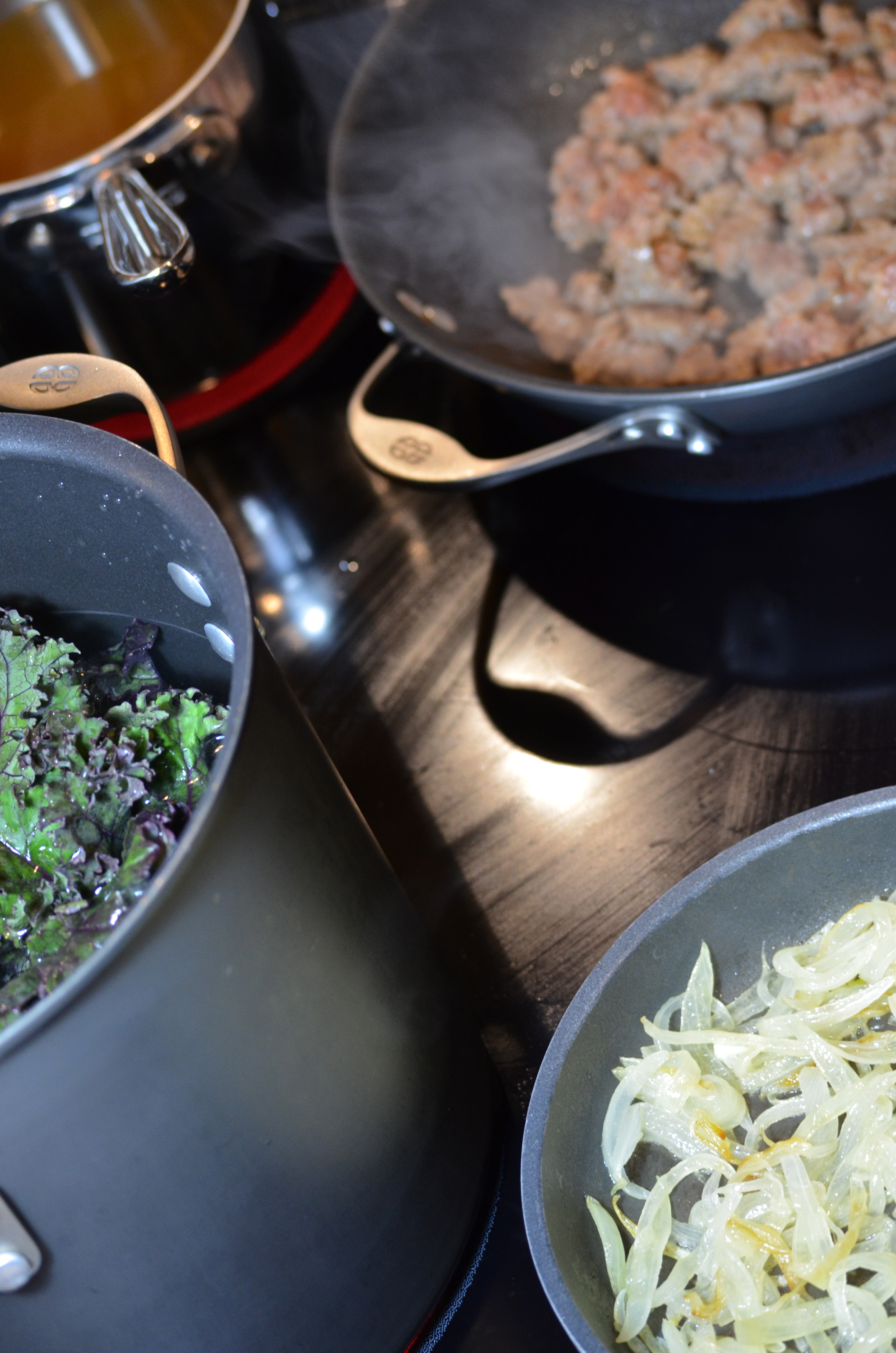 Better, right? The good news is that most of this can be done well in advance of throwing it all together at the end. You can also do some shortcuts like leaving out the sausage and just sautéing the onions in the final large skillet rather than caramelizing them if you so choose.