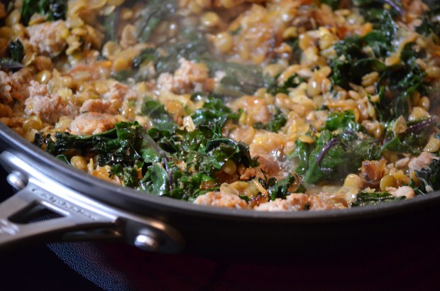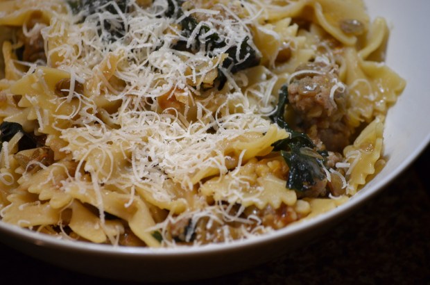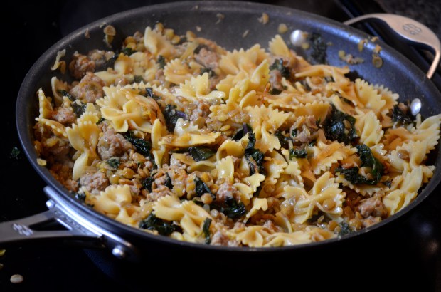 At this point, it’s time to finish up. Drop your pasta (and I used bowties but think that orecchiette would be great too) and heat your large saucepan with the sausage goodness back up. Add in the sausage, onions, lentils, kale, red pepper flakes and about 1/2 cup of the lentil cooking liquid and heat through. Don’t forget to grab some pasta water too!