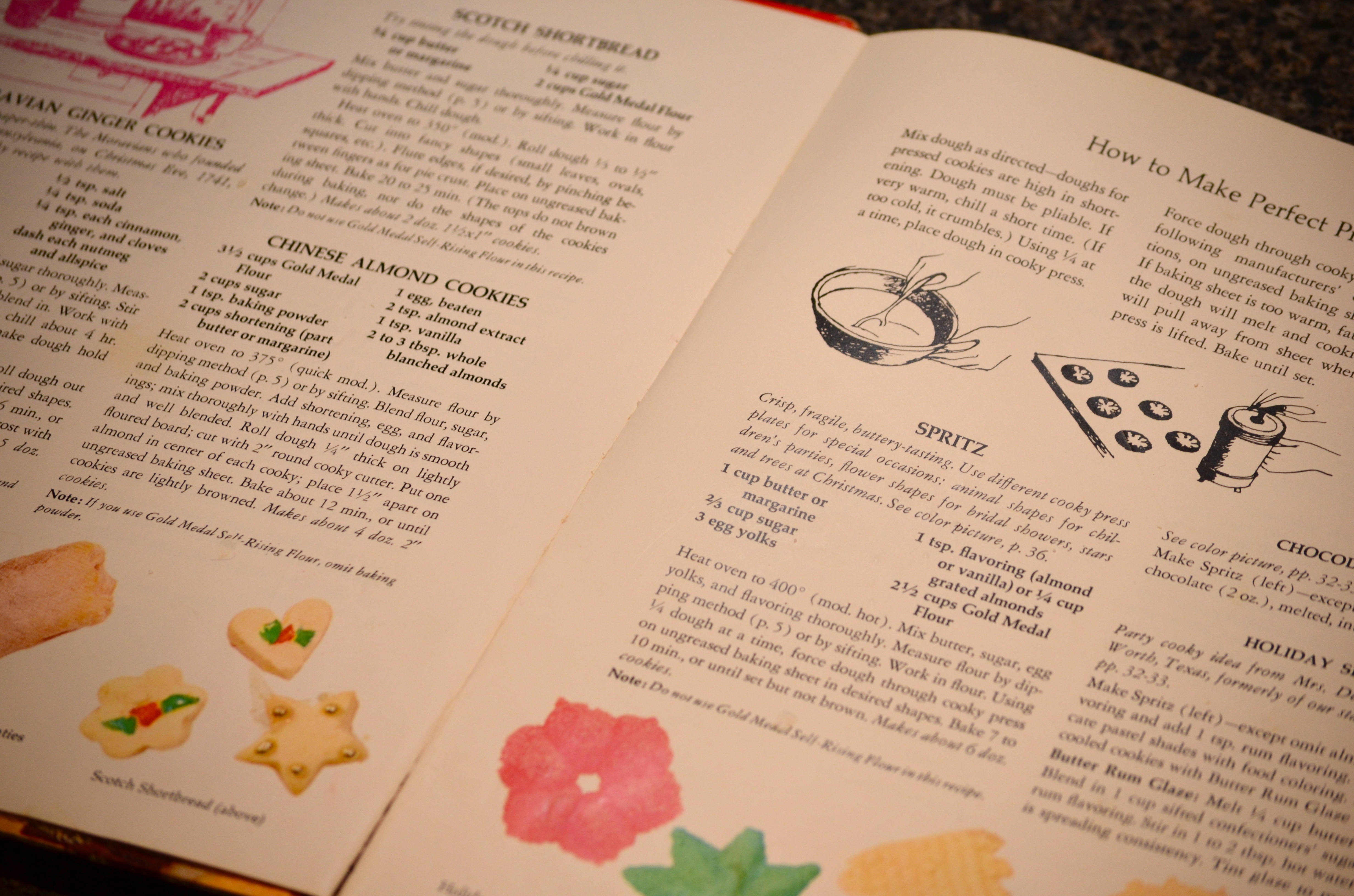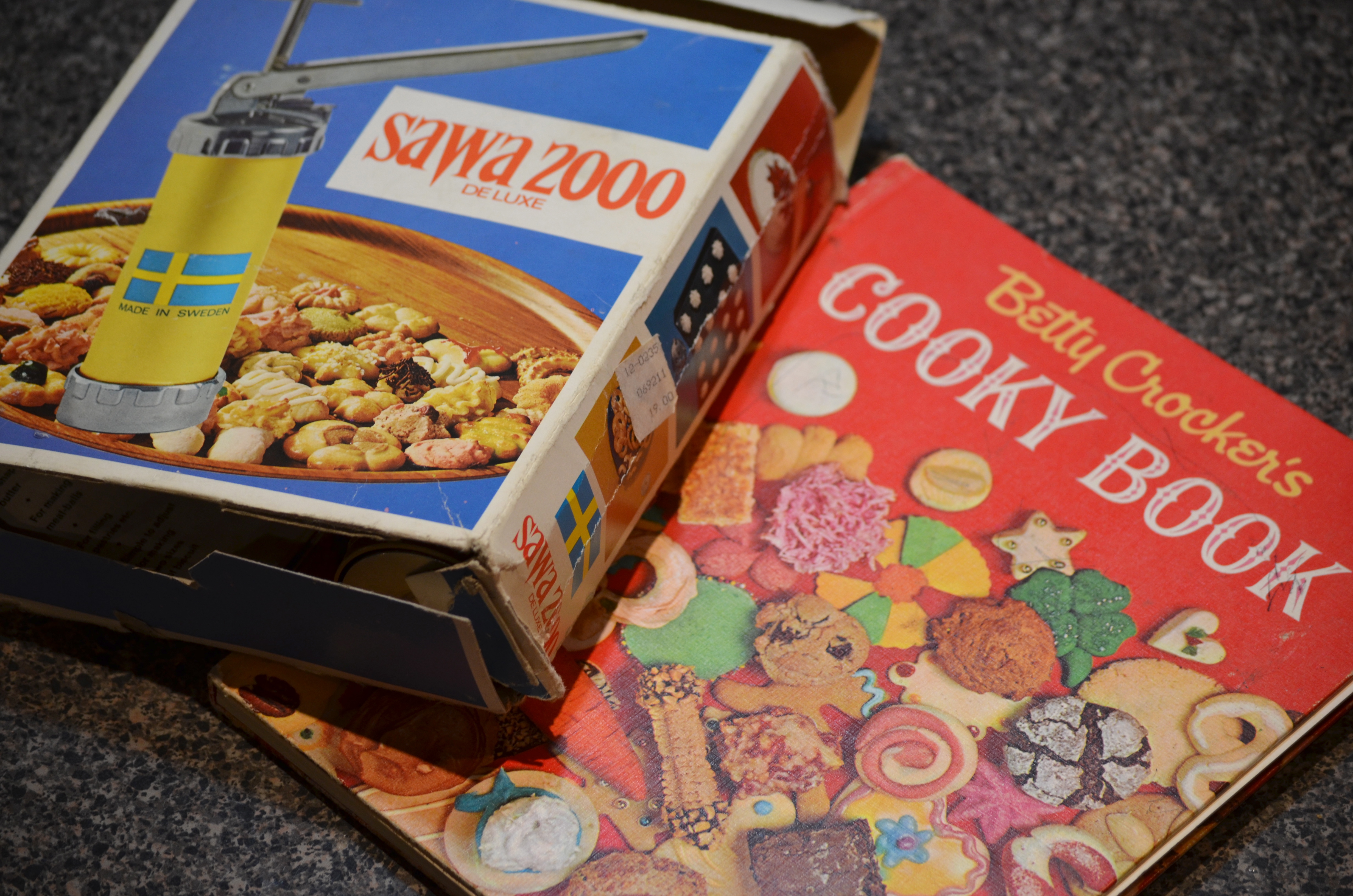 Remember a simpler time? When recipes were written on index cards, when MCI was a valid long-distance carrier, when long-distance calls were a thing, when manufacturers signaled an innovative item by adding the number 2000 afterwards and when cookie was spelled with a “y”?* Tonight I decided to single-handedly break the space-time continuum in my kitchen with the help of Betty Crocker’s trusty Cooky Book and my cookie press, Sweden’s best, the Sawa 2000.