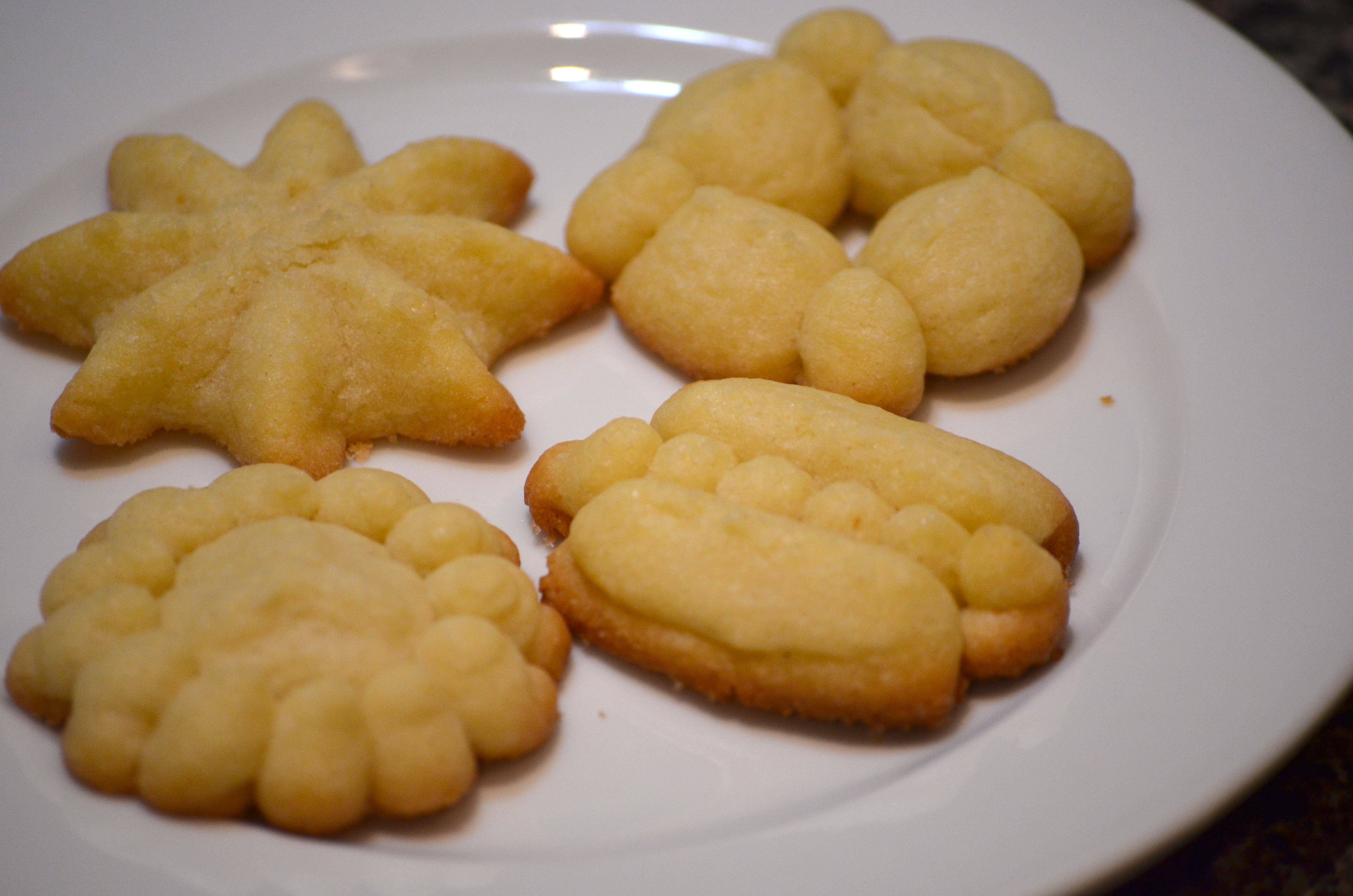 I have since cut back on my holiday baking extravaganza but try to make time every year to keep one of these traditions alive. And for the past couple years it has been spritz cookies made in the cookie press. Quite possibly the worlds easiest cookie dough to make, I decided to make this tonight around 6:00 and was out of the clean kitchen by 7:00. Evidently since my younger days not only have I grown enough to have some leverage when it comes to pressing out the dough but I’ve also become slightly more efficient in my baking. I suppose if you don’t have a cookie press you could just roll it into balls and press with a fork, but if you remember dreaming about the Play-Doh Fun Factory in all its extruding glory as a child and couldn’t sleep the night before your 7th birthday, then you should run out and buy yourself a cookie press.
