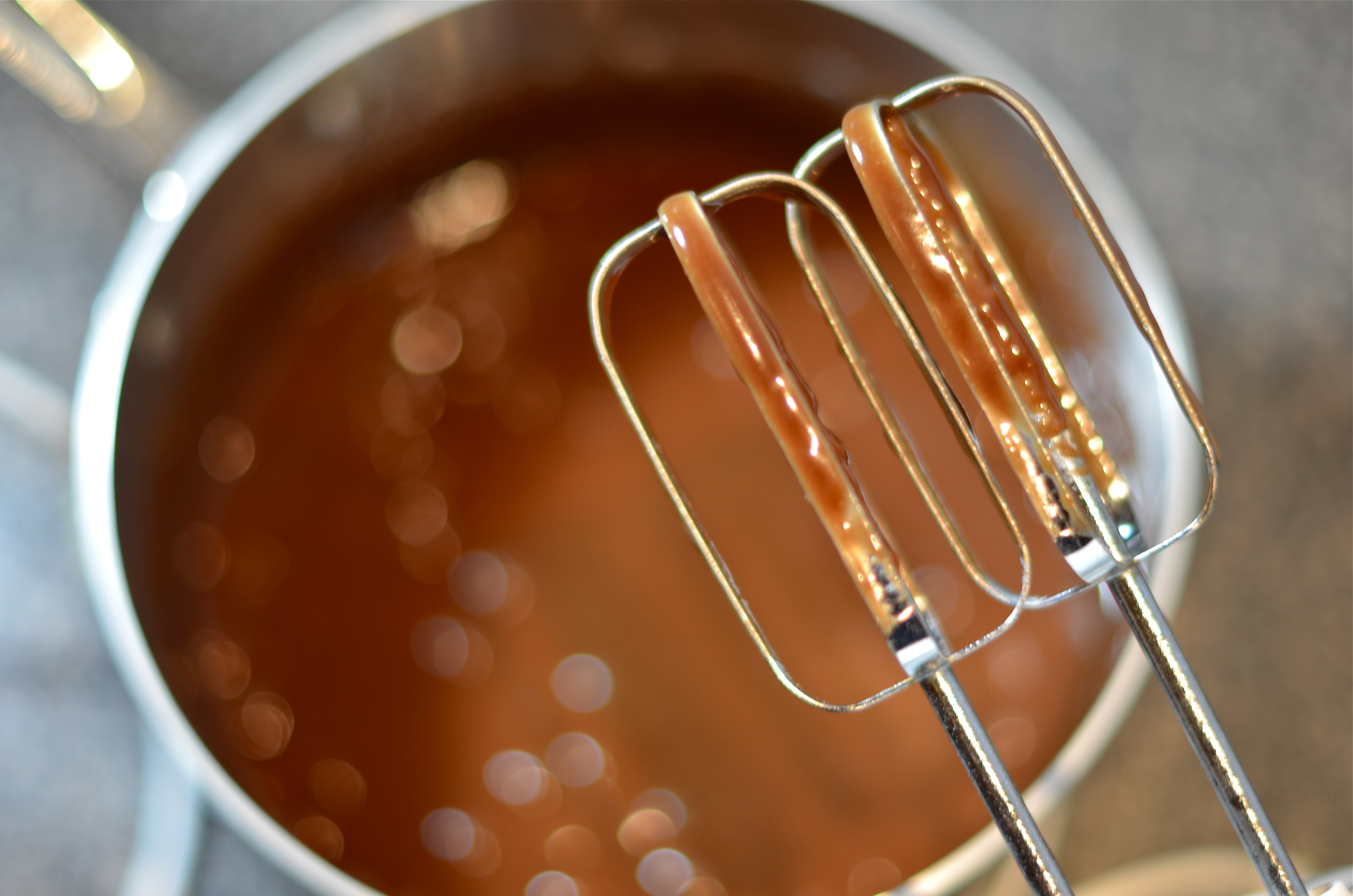 Once things have boiled briefly, pull the pan off the stove and bring over to the counter where your hand mixer is plugged in and ready to go. Add the dry ingredients to the cocoa mixture and blend until well-combined.