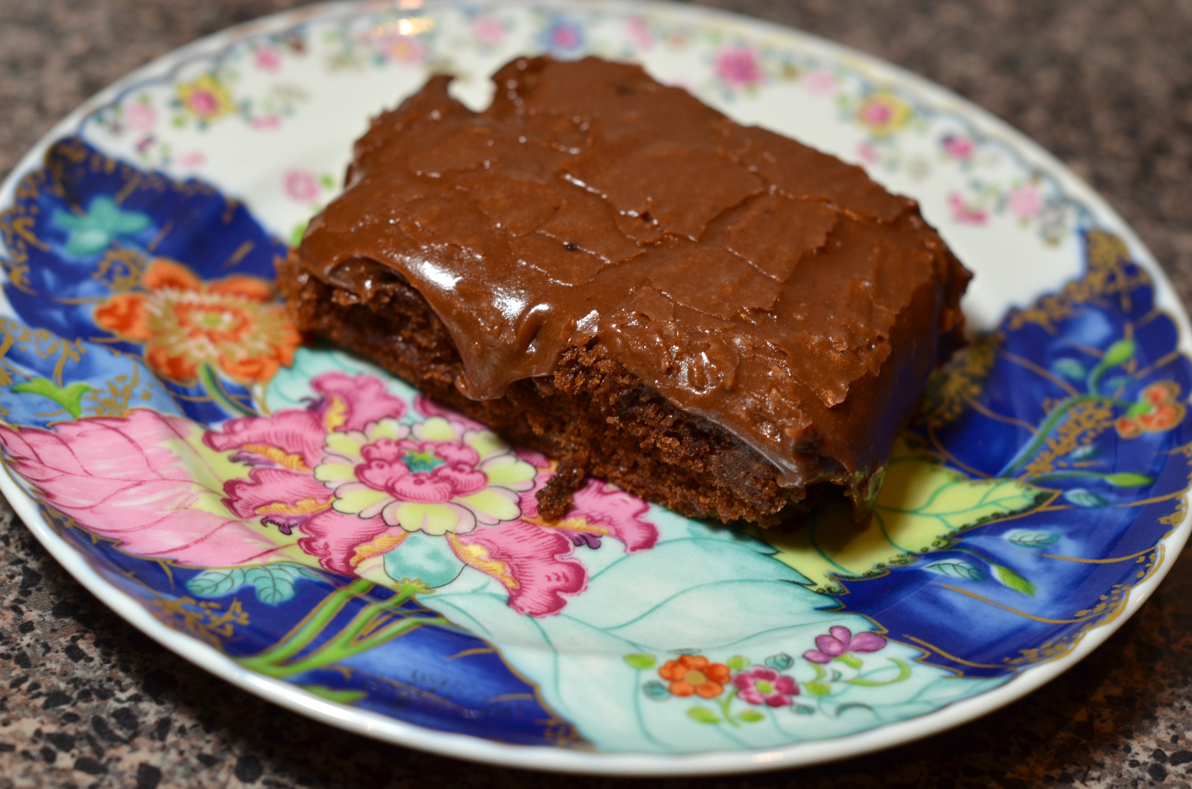 Essentially this is a chocolate buttermilk cake that you ice warm (which means you can eat it sooner). I used to make it in a larger jelly roll pan but I opted for a 9″x13″ metal pan because I have a cover for it and can leave it on the counter for easy access at breakfast, lunch and dinner. As such, the cooking times are for a 9″x13″ pan but if you want to go hotter and flatter a la Thomas Friedman, then go for it. Just adjust the cooking time accordingly.