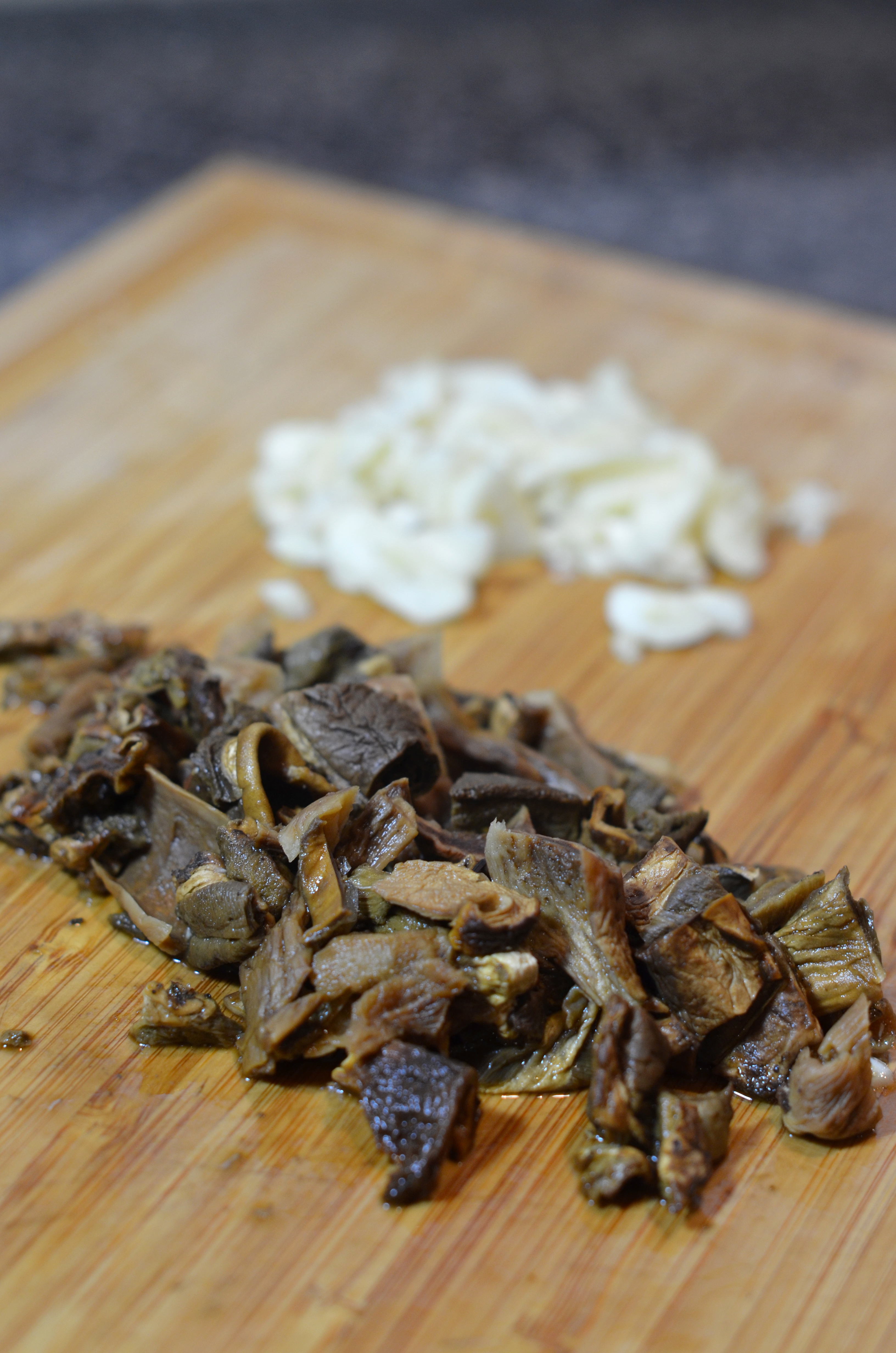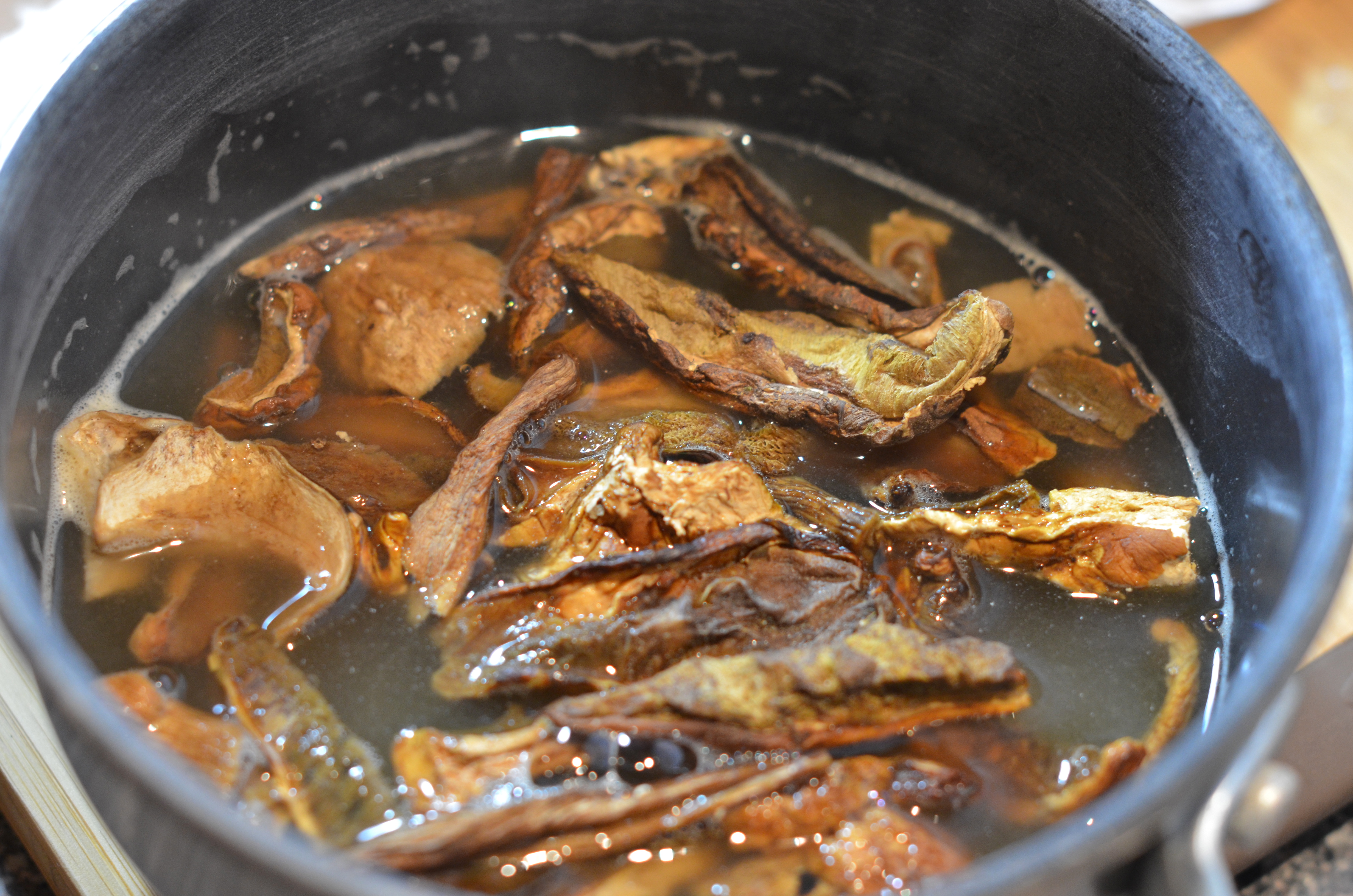 First things first, you need to revive the dried mushrooms. Bring the cup of chicken stock to boil on the stove and add the mushrooms. Take off the heat and cover for 15-20 minutes until they reconstitute.