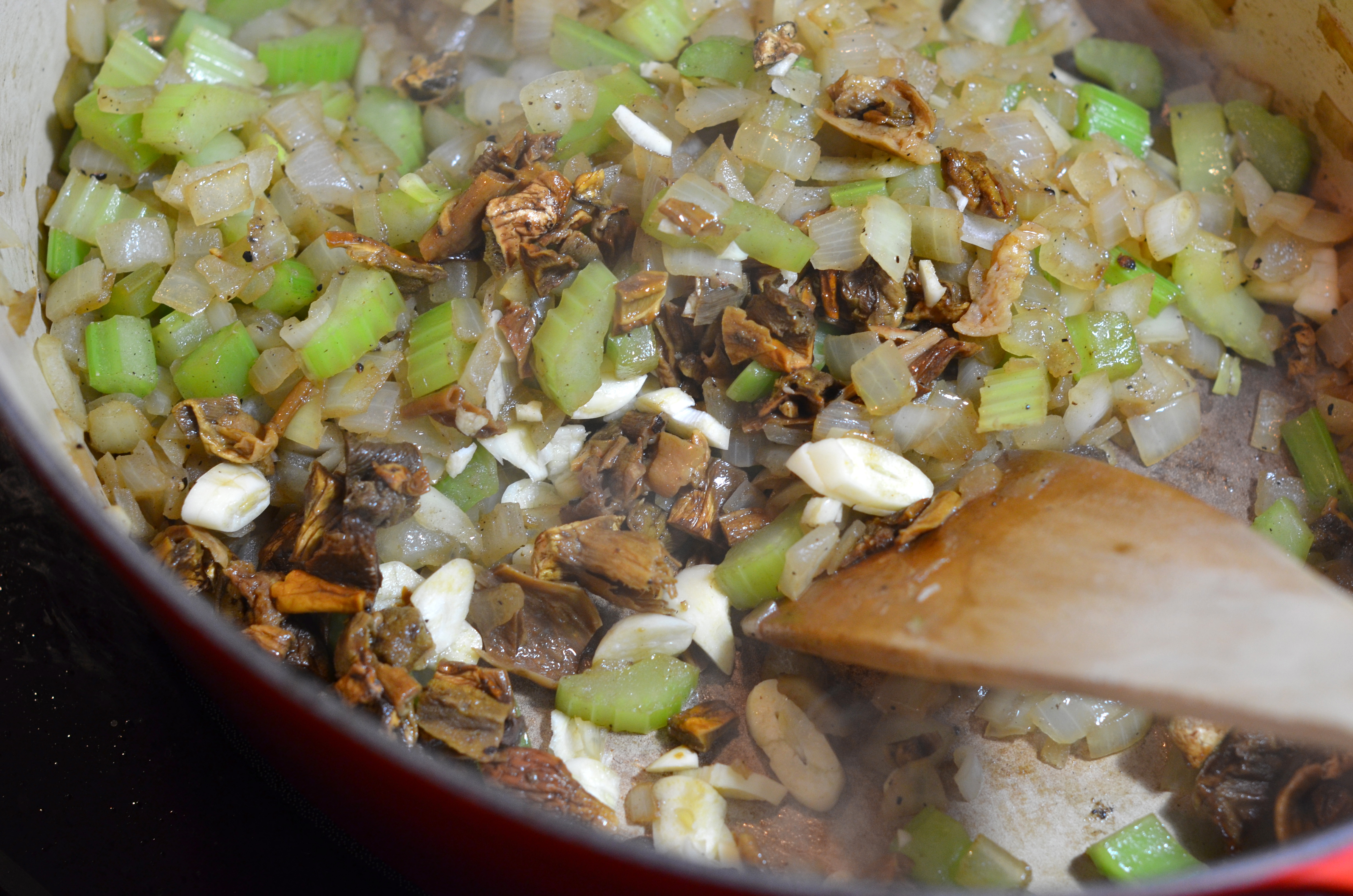 Add the garlic and porcinis to the browned onions and celery and cook for another minute.