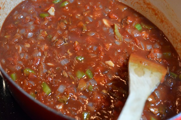 Now add the tomatoes and chicken/porcini broth to the pan. If you only have diced or crushed tomatoes like I did, don’t worry about it. Those will work just fine. After cooking the tomatoes for about 5 minutes, add the cup of red wine and bring the mixture to a boil.