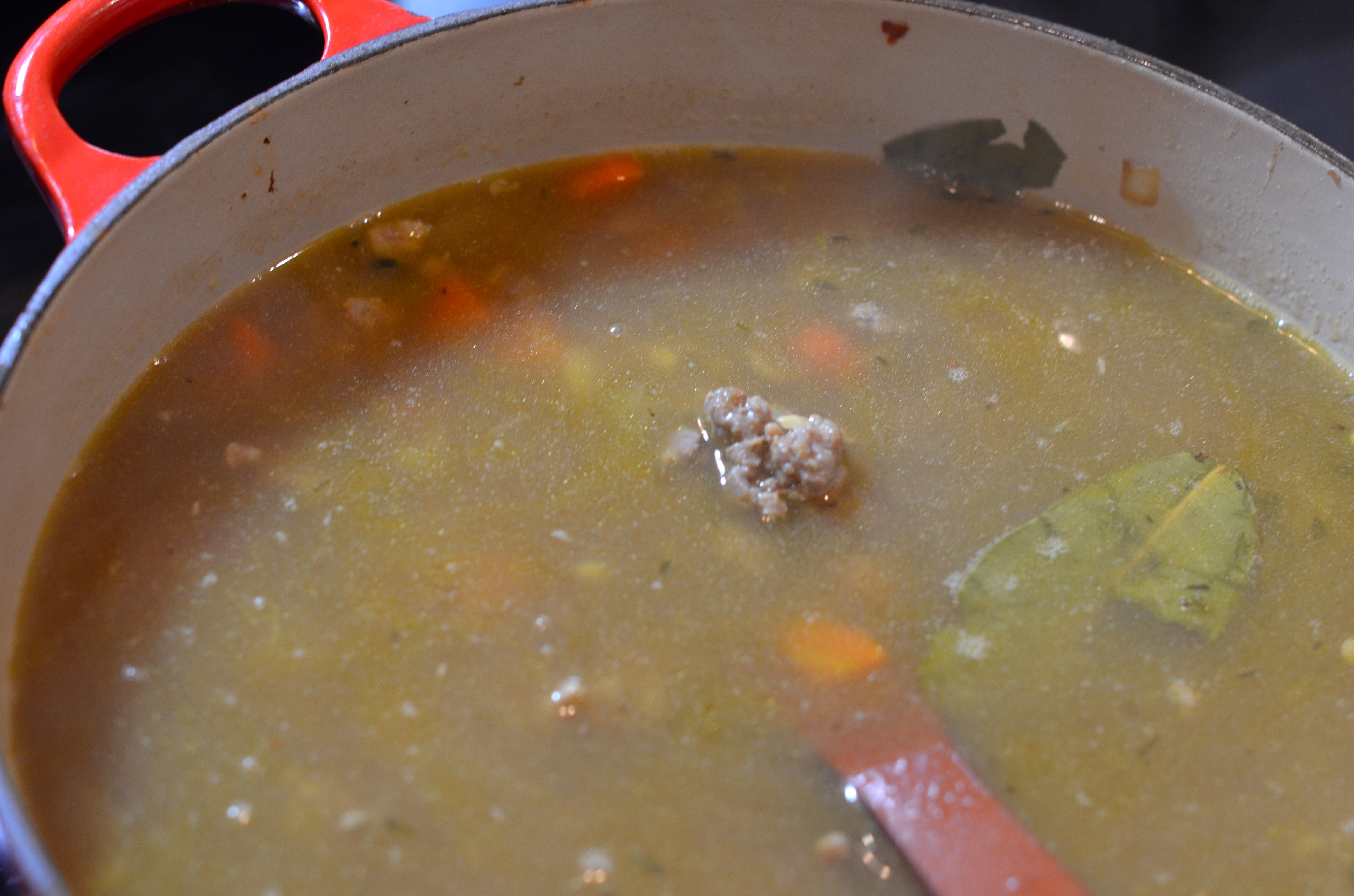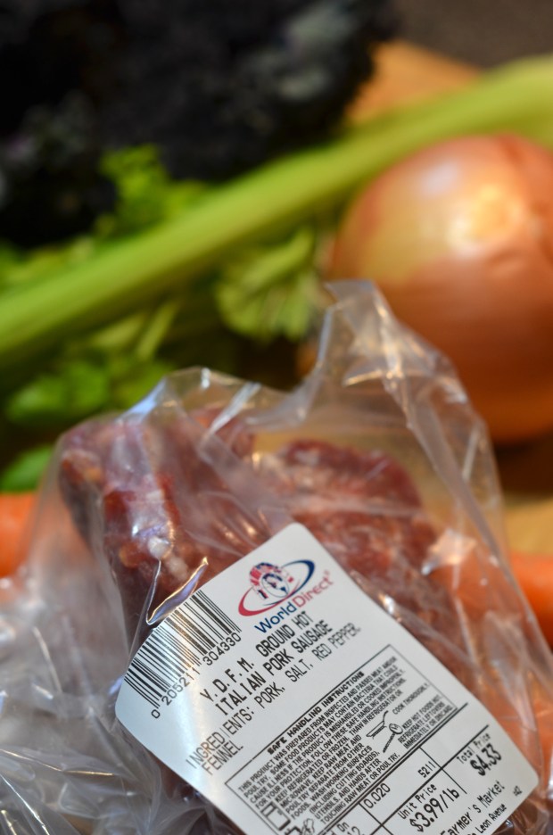 First things first, homies: always brown your meat in whatever vessel the soup will live in first. We’re building flavor here and that’s a key first step. Heat a teaspoon of olive oil over medium-high heat in a heavy bottomed pot and brown the sausage within. While that’s going down, it’s a good time to prep all your veg.