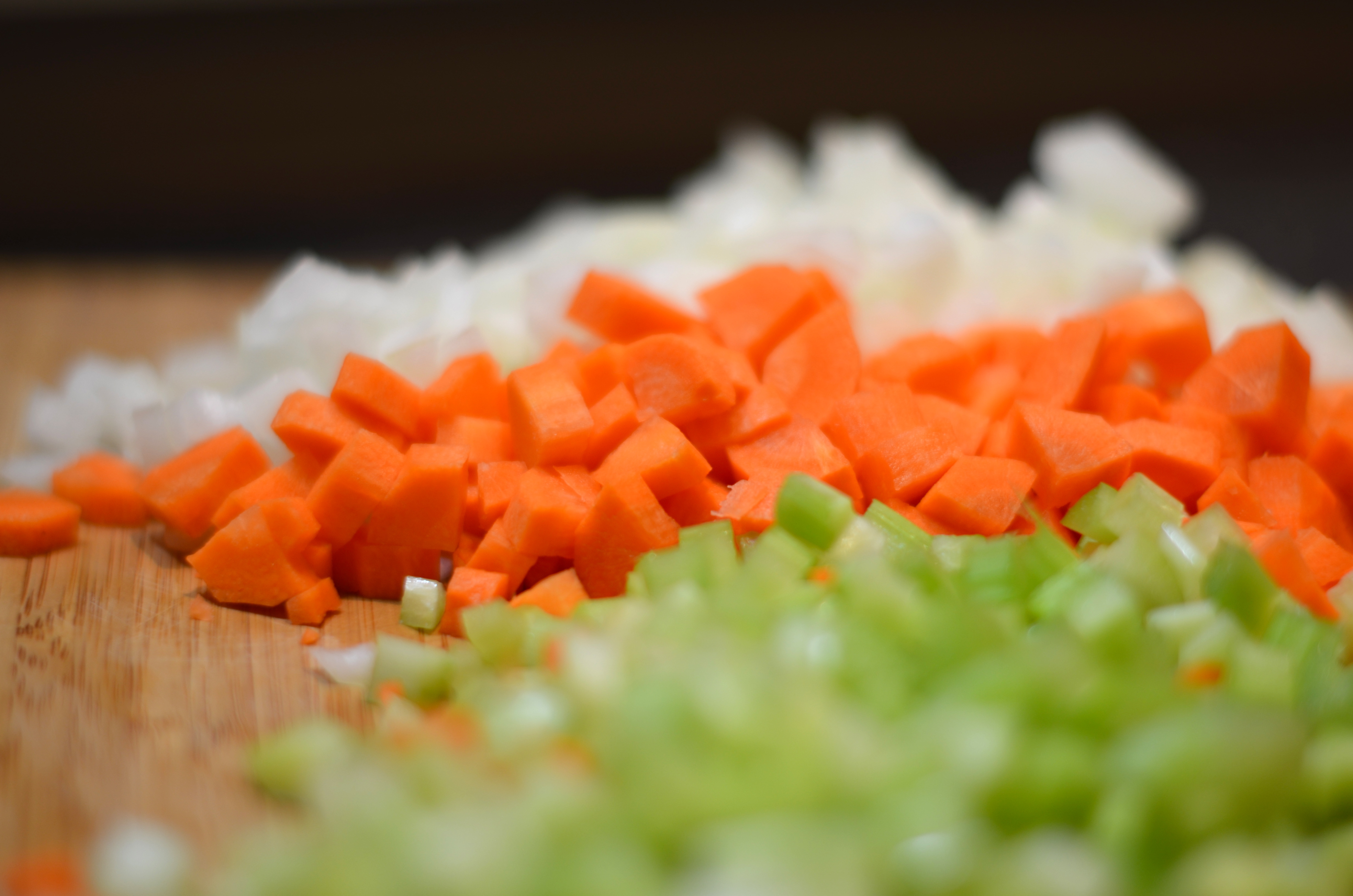 If there is a bunch of fat in the bottom of the pot, dump it out without sacrificing too many delicious sausage bits that may have happily congregated. Keep your pot at medium-high heat and saute the mirepoix (fancy word for the three flavor builders that you’re using: onion, celery and carrot) in the pork-bits and a bit of olive oil if you need it until they begin to brown and soften. I trust any recipe that starts this way.