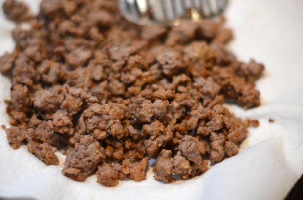 Once your sausage is brown, fetch it from the pot and put on a plate lined with a paper towel to soak up some of the excess fat.