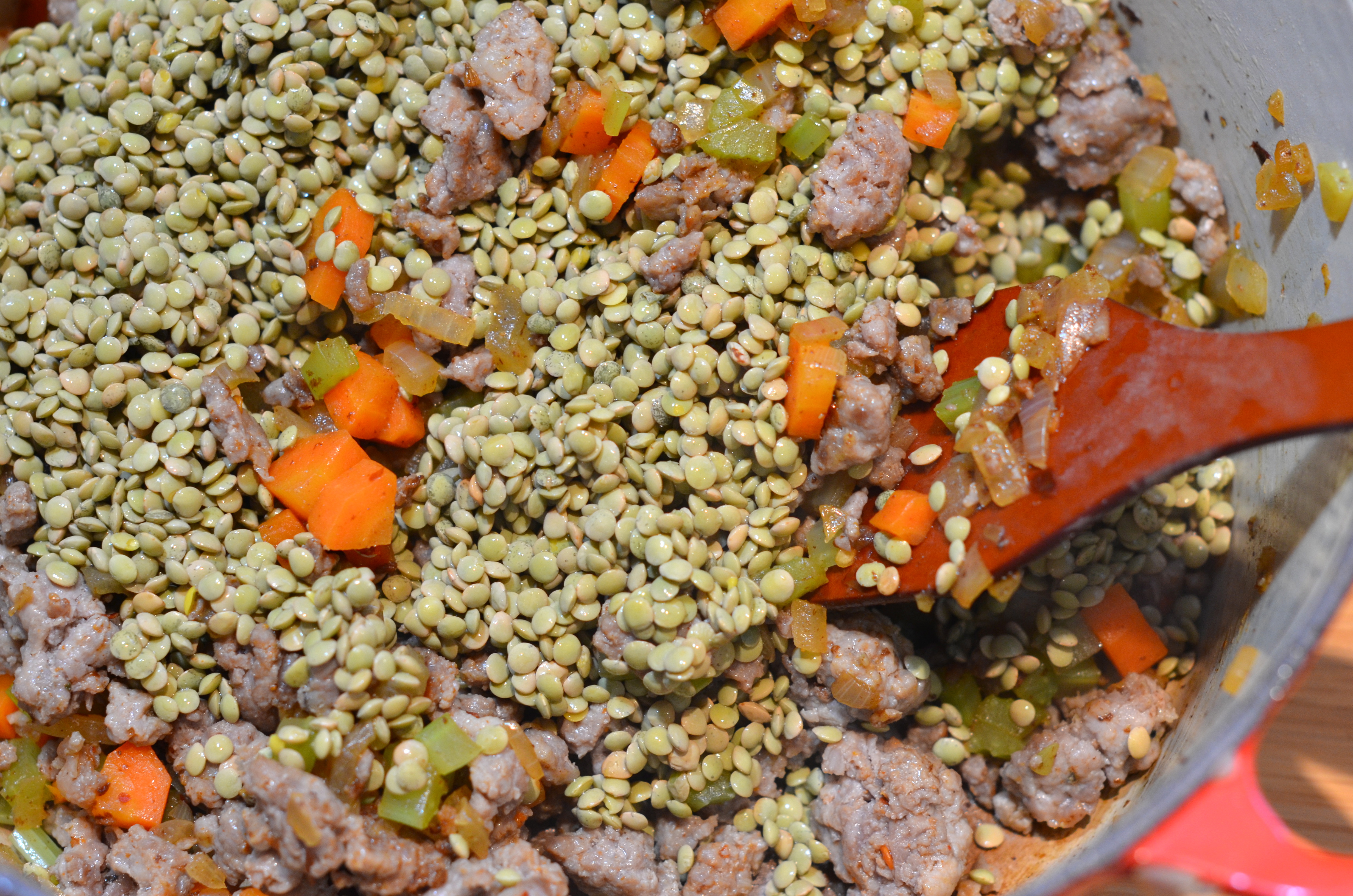 Once things begin to soften, add the sausage back to the pot along with the rinsed lentils and give everything a good stir to ensure that your flavor is evenly distributed everywhere.