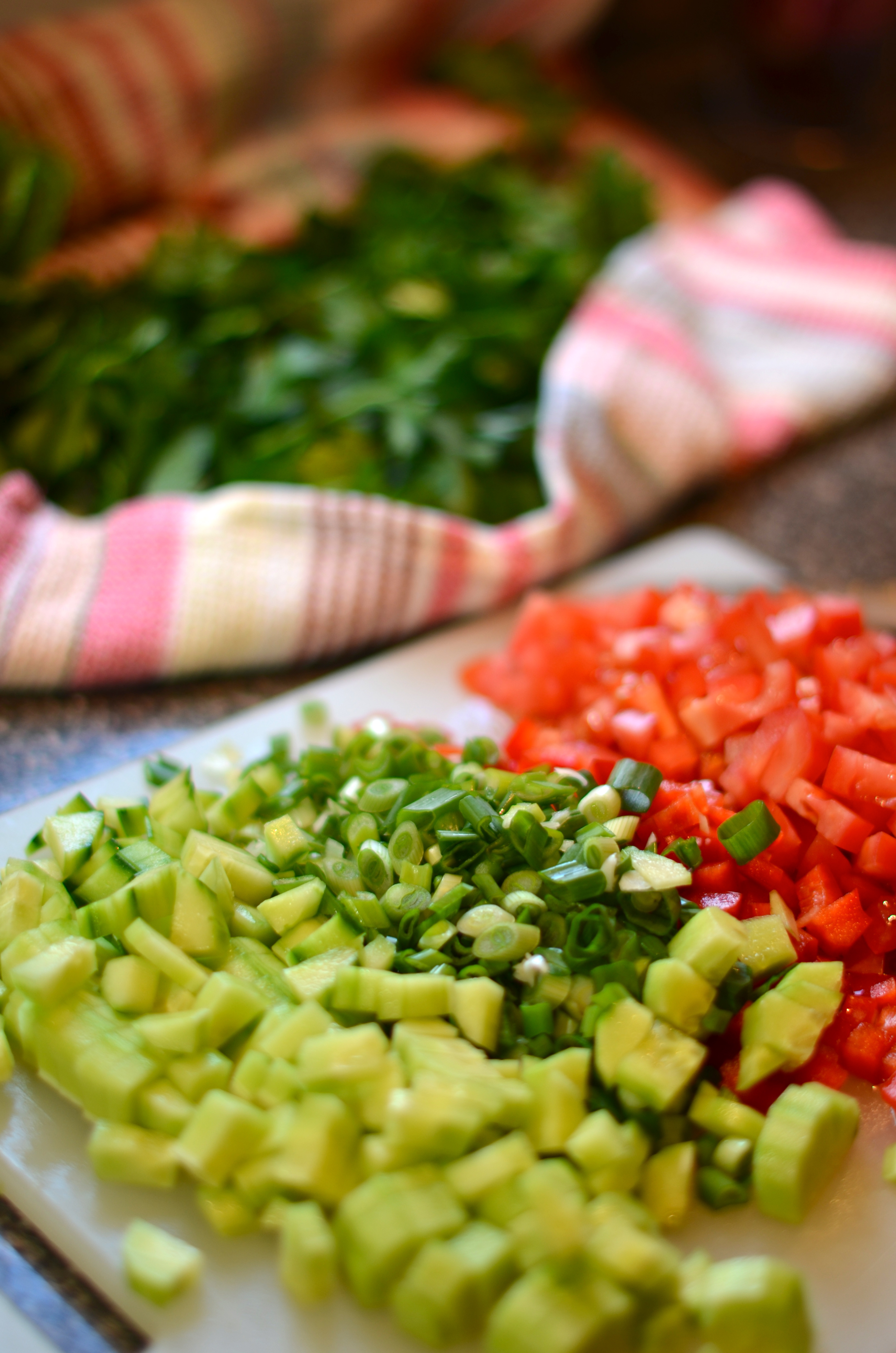 This is really easy and is a great opportunity to practice your knife skills. Let’s do the tabbouleh first. You’ll want it to have a couple hours to sit and get all flavory before you eat it.