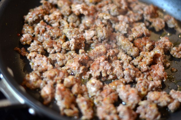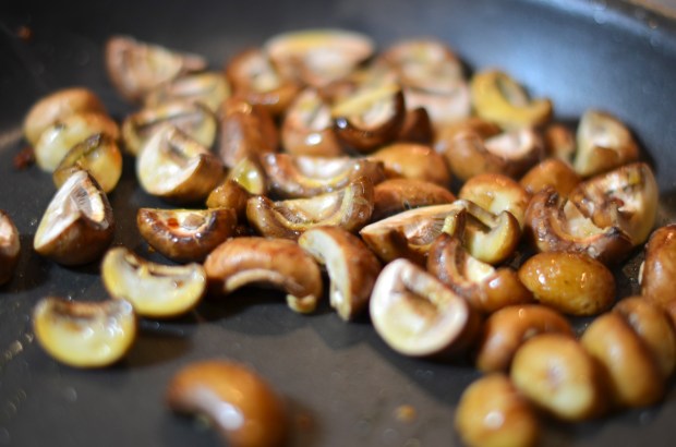 Pull the sausage out of the pan to drain on a plate with a paper towel and give your pan a quick wipe-down to get the excess fat out (while leaving the tasty bits of pork). Add the mushrooms and saute over medium-high heat for 5 minutes.