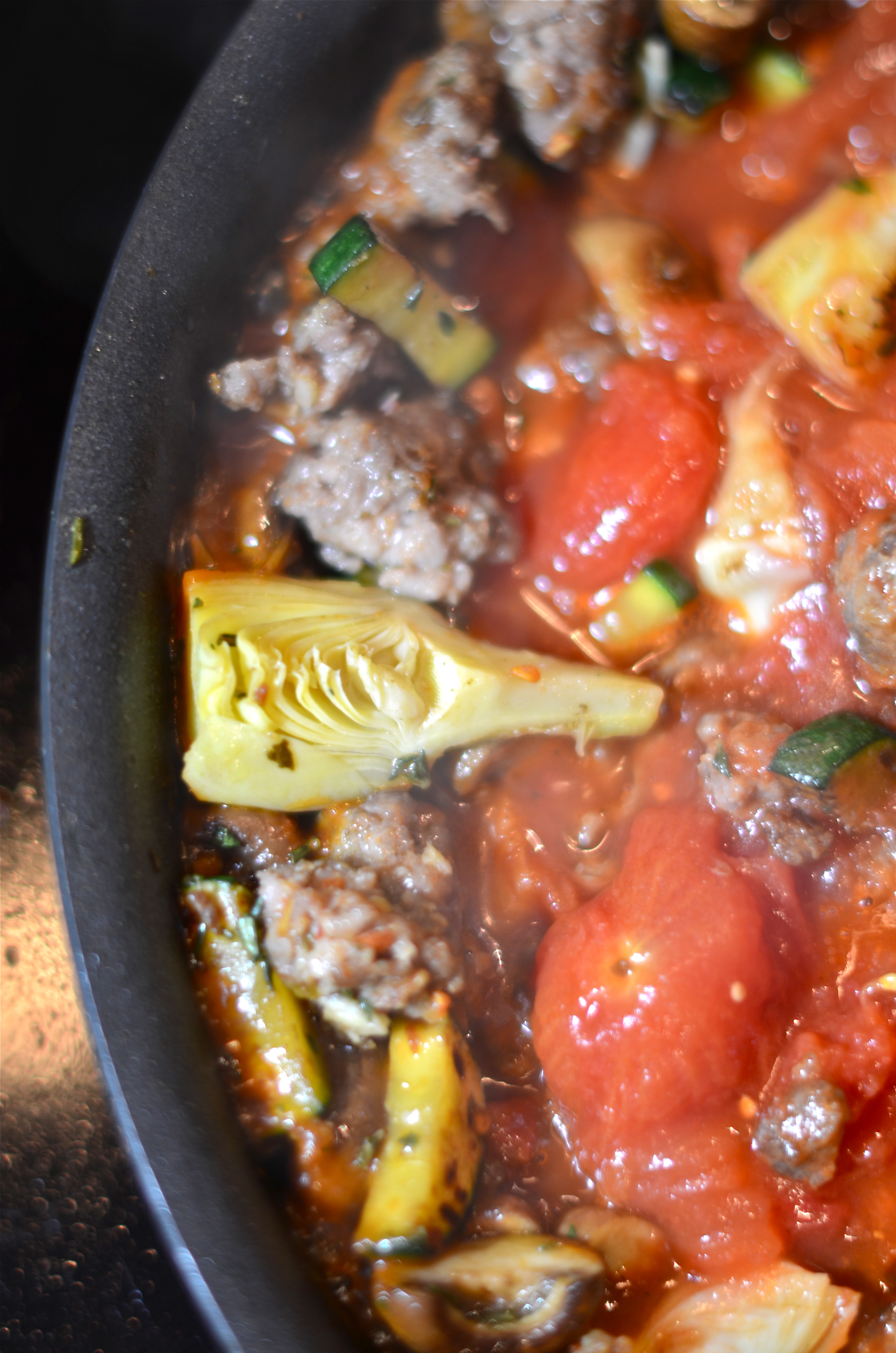 Once the artichokes have a bit of color, add your sausage back to the pan and then add the can of whole tomatoes. Either crush them in your hands if you feel like getting down and dirty or take a spoon and break them up as you go.