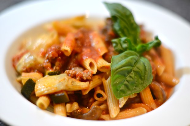 T-Flo Strikes Again {pasta with sausage, mushrooms and artichokes}
