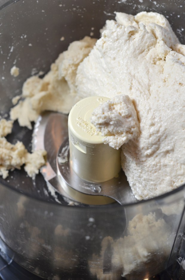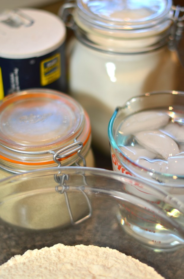 Rather than a stand mixer and a dough hook, which used to be my shortcut to kneading everything by hand, you’re actually going to use a food processor (with the metal blade, not the dough blade) to make this dough. It’s a shortcut’s shortcut. It’s amazing. Measure out your flour, sugar and yeast and dump into the food processor. Give it a whir for a good 10 seconds to get everything distributed. Now, get your ice water ready. In order to accomplish this, I had a large measuring cup of ice water set aside and right before I was going to use it, I measured out 1 1/3 cups (strain the ice) into another Pyrex. Turn the Cuisinart on and slowly pour the water in through the top until your dough comes together – only about 10 seconds.