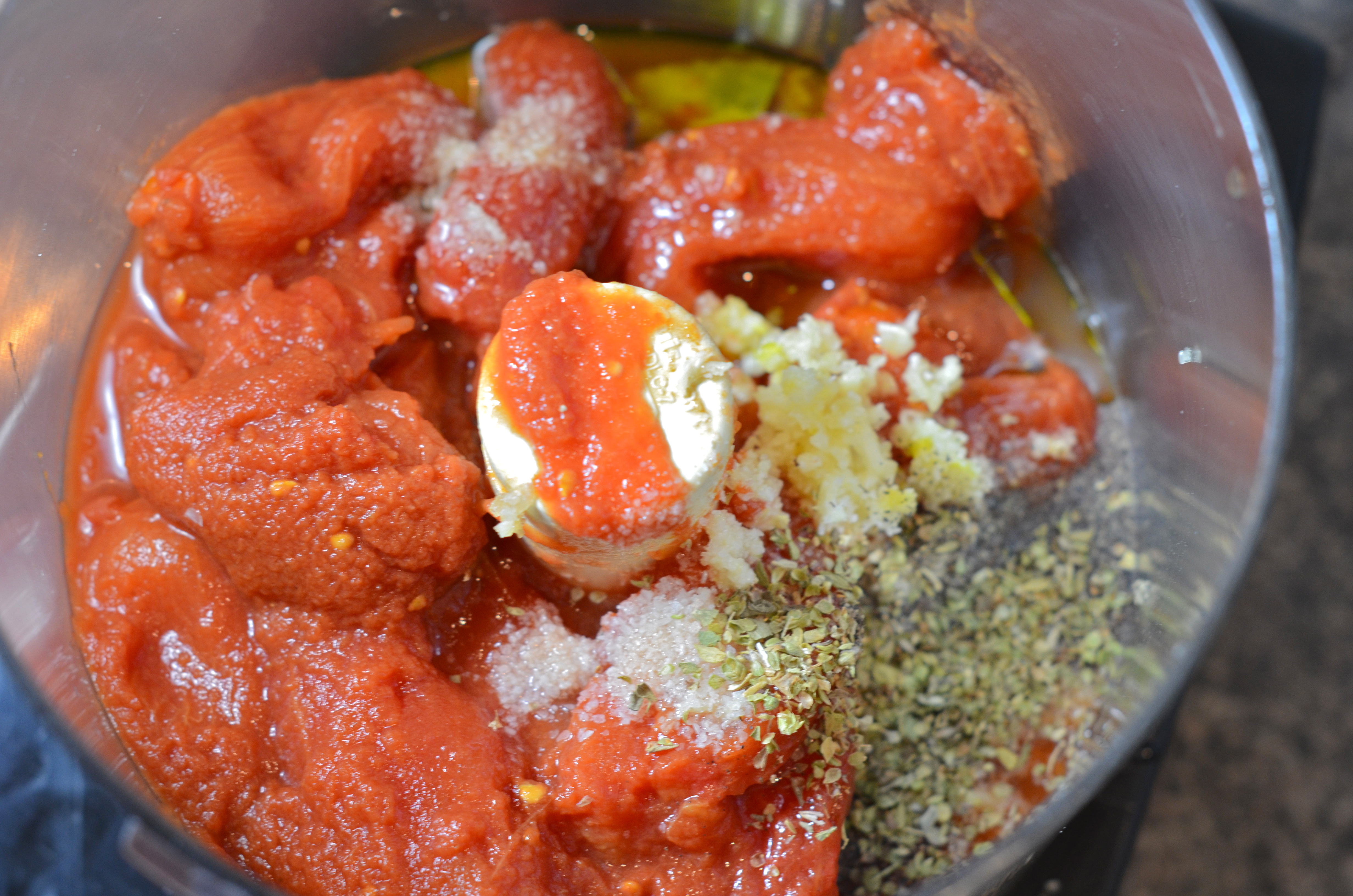 This recipe is even easier than the other. Besides a dough that comes together in no time, with little effort, the sauce is a no-cook sauce. Really, the only thing working hard is the food processor and he doesn’t mind.