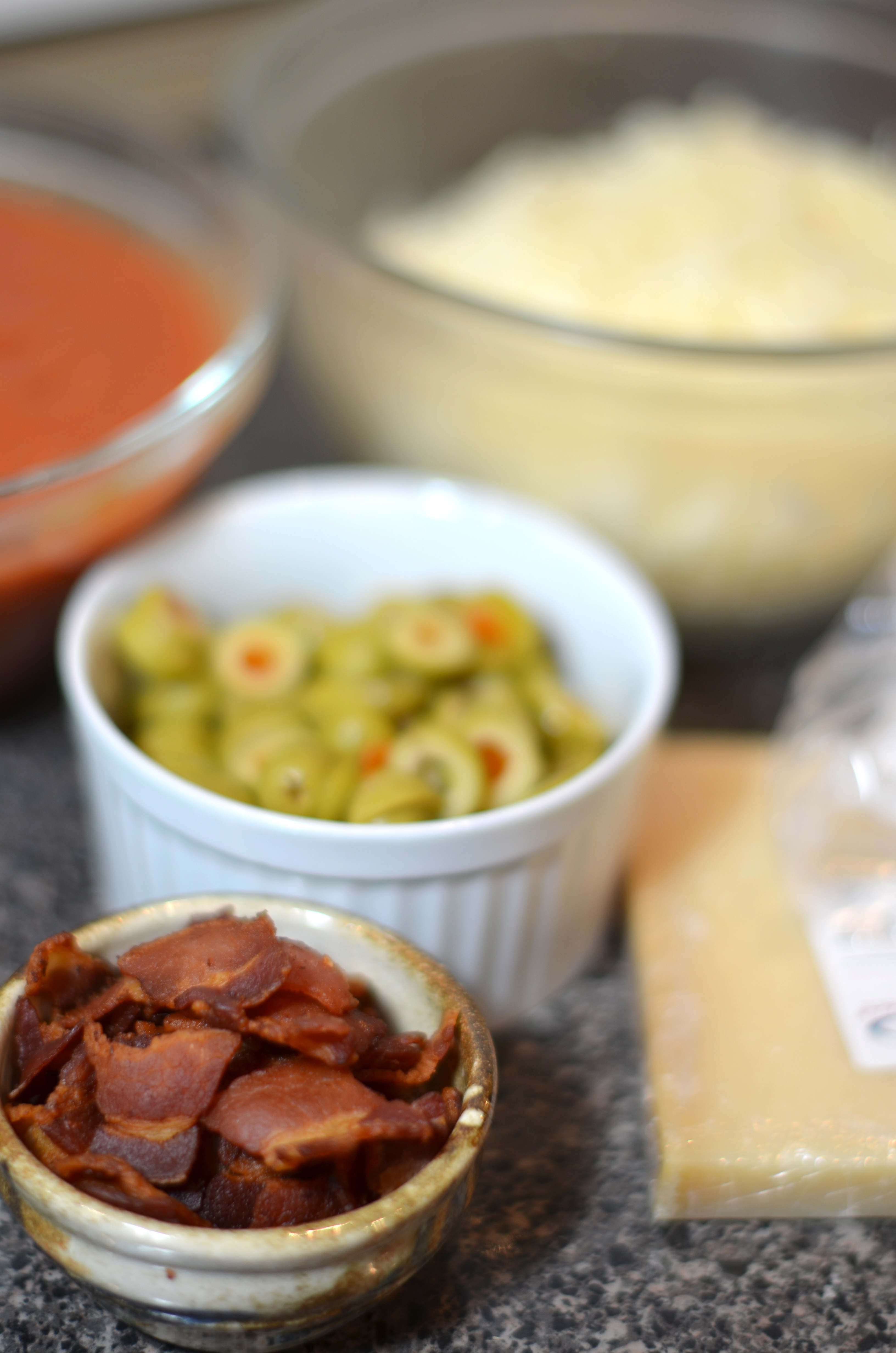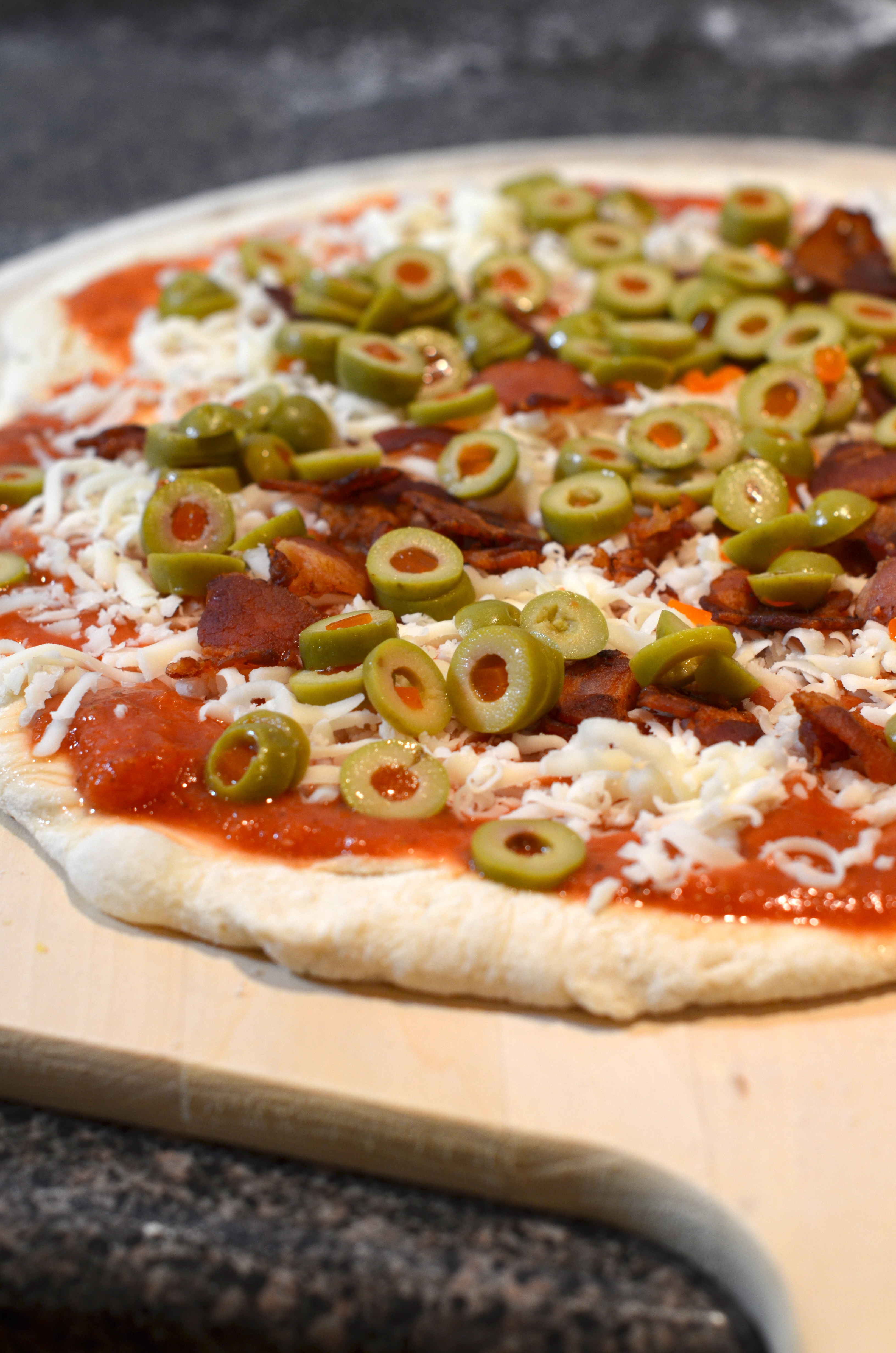 Toppings time. I decided to do bacon and green olive and straight up pepperoni. I ate half of the bacon before it was time to make the pizza though. So be sure to double whatever it is you think you’ll want on the pizza so you won’t have to deny yourself a little bacon fuel throughout the process.