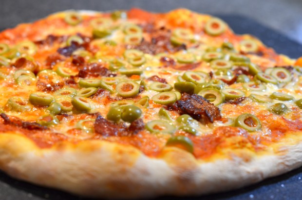 After about 12-15 minutes, you should have this. And if you’ve never tried a bacon and green olive pizza, you must. Talk about salty tasty goodness…