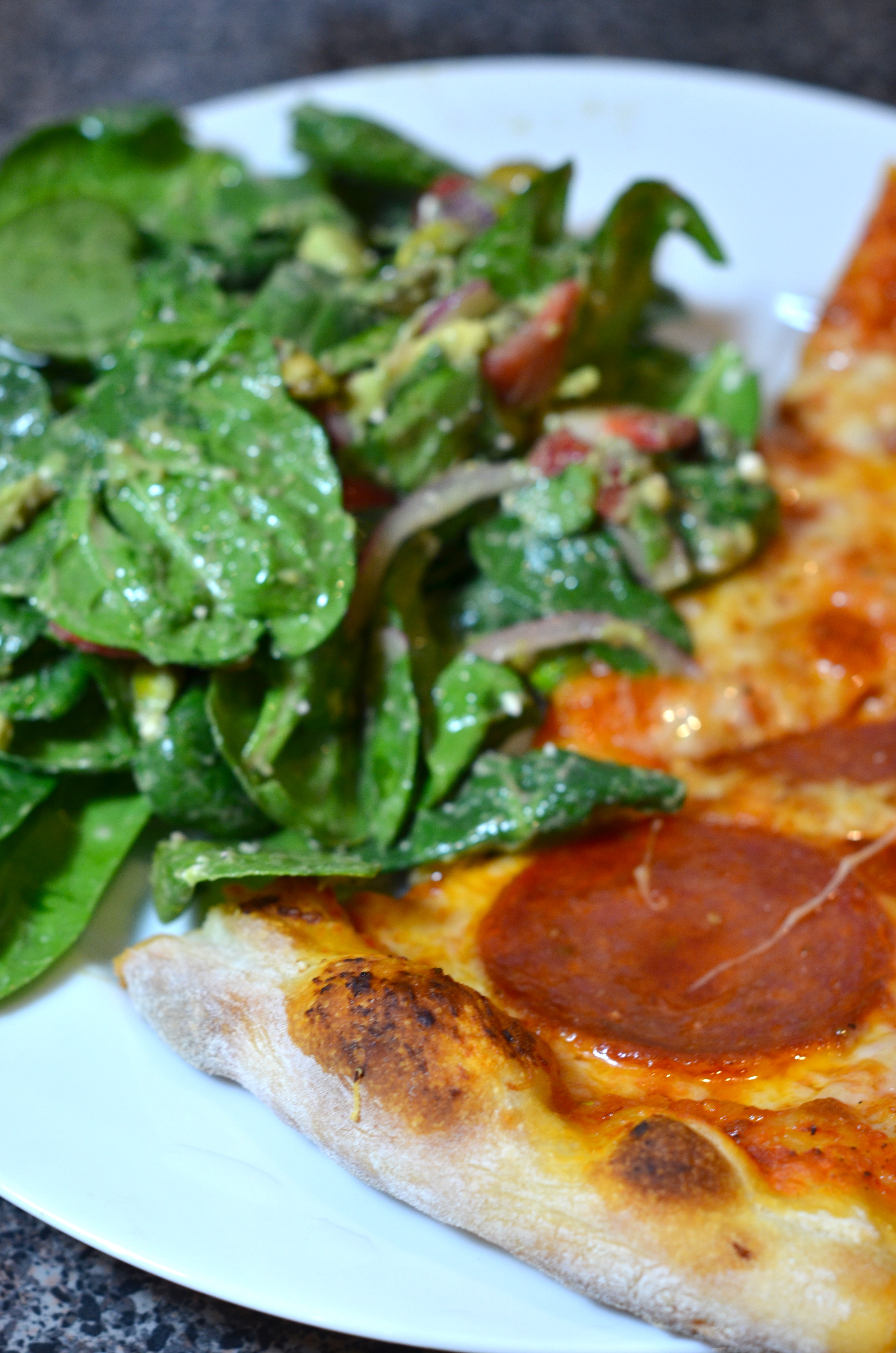 Because I try to keep from eating an entire pizza myself, I decided to make my new favorite salad too: baby spinach, red onion, strawberries, blue cheese, pistachios and vinaigrette.