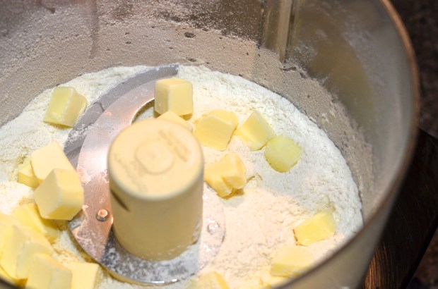 Put the flour, 1/2 cup sugar, baking powder and salt in your Cuisinart and give it a quick whir to “sift”. Grab your butter out of the fridge (you want it to be cold) and cut the 6 tablespoons into cubes and drop into the food processor.