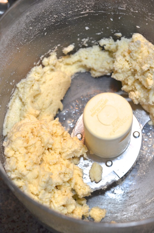 Process for about 10 seconds or until you reach that tasty “wet sand” consistency we all talk about as though it were something we’d want to eat instead of get out of our bathing suits. Remove the little pouring spout plug, and with the Cuisinart running, pour in the milk and process until just combined. The dough will be sticky and delicious.