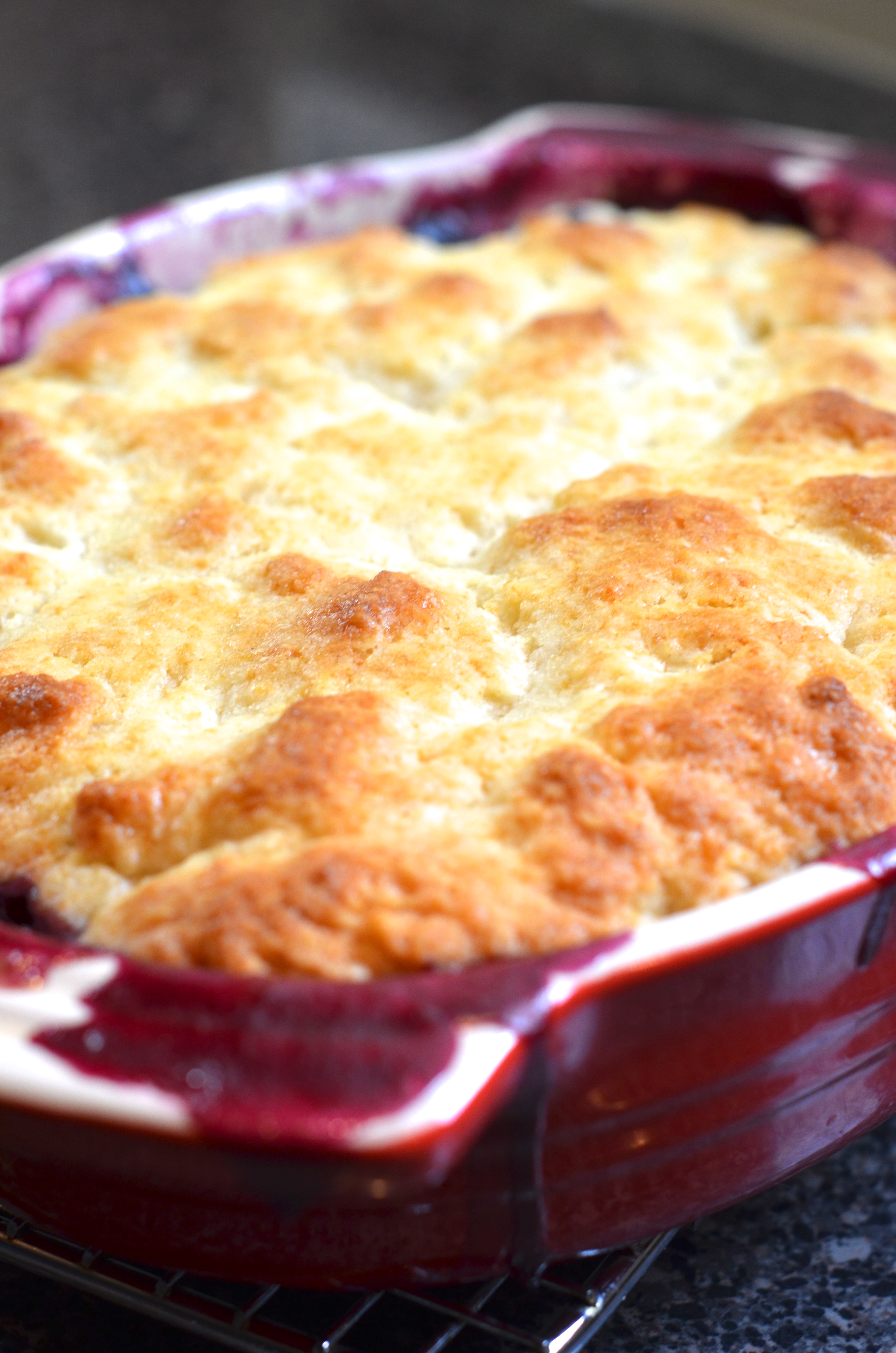 Place the cobbler on a sheet pan to catch the bubbles – because big blue bubbles you will have – and bake for 40-45 minutes until, well, bubbly.